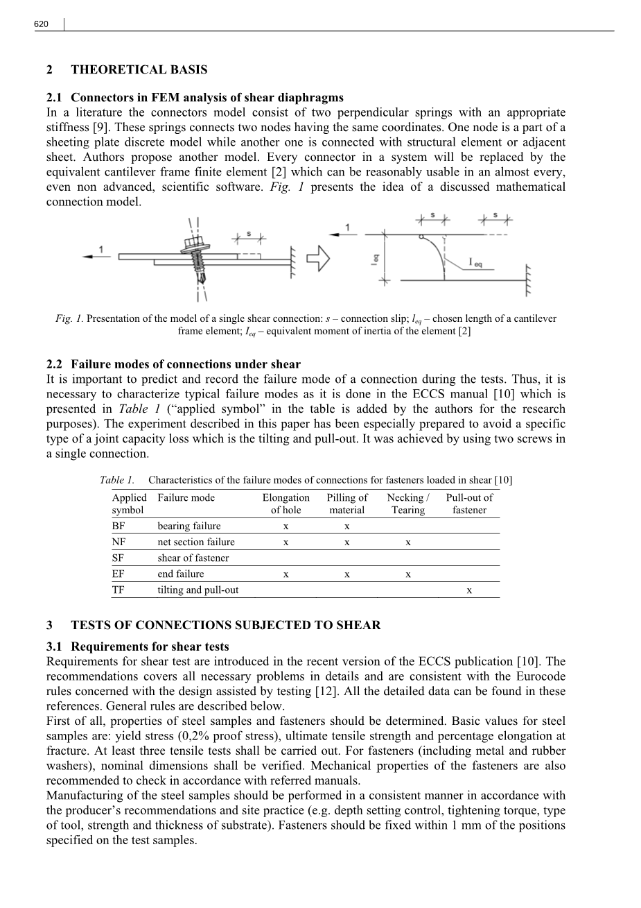 许多研究描述了轻型钢结构连接件的性质。给出了一些关于关于螺栓连接和盲孔螺栓连接的工作,比如Wuwer W的一些工作。人们通常研究冷弯型材框架中的完整接头,这些研究也在【6】被描述中。一些人研究在受火环境下连接件的性质。根据设计规范,本文中被提到的研究需要考虑一组在正常静载荷作用下的单个自攻螺钉连接。这些考虑对用于所有连接件的线性模型的提出有一定的影响。(作为在【1】中所给的替代,0.25mm/kN是适用于所有总直径在4.1mm~4.8mm的螺栓)。作为延伸,特殊用途的双线性函数被发展出来。