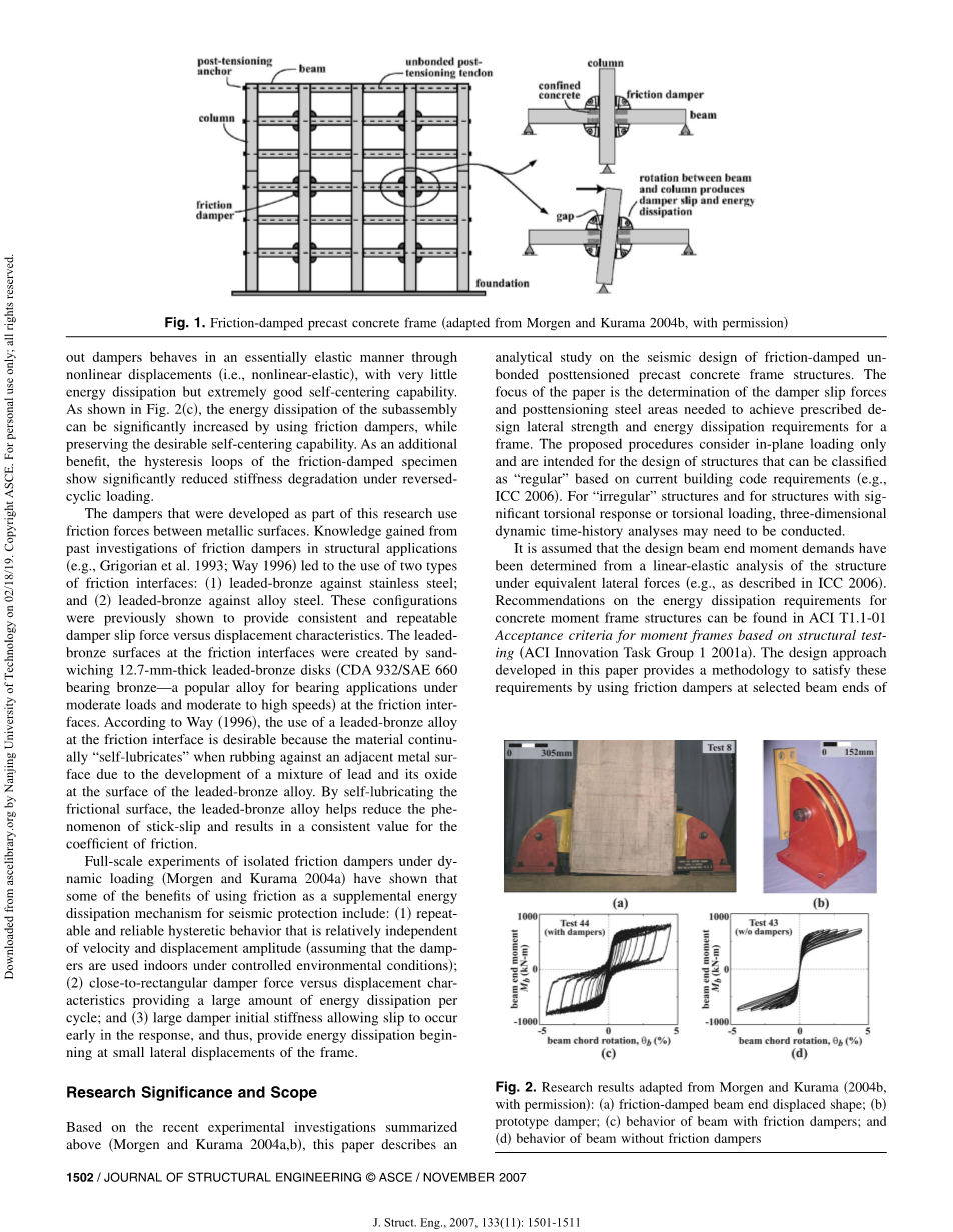 摩擦阻尼器的贡献具有弹性,完美的塑料共即。弹塑性兲滞回行为,整个能量耗散在图4共兲摩擦阻尼器提供的。因此,梁结束时刻的贡献后张钢使用弹性表示尽管非线性共双线性兲moment-rotation行为如图4所示共c兲关。,bilinear-elastic行为,类似于图2共d兲兴。这双线性弹性组件提供了自动定心的能力结构,同时允许软化共。、刚度减少兲,伸长时期发生。注意,图4中的非线性行为共c兲由缺口梁的一端的开口关见图2共一兲兴,因此没有发生重大损坏结构。