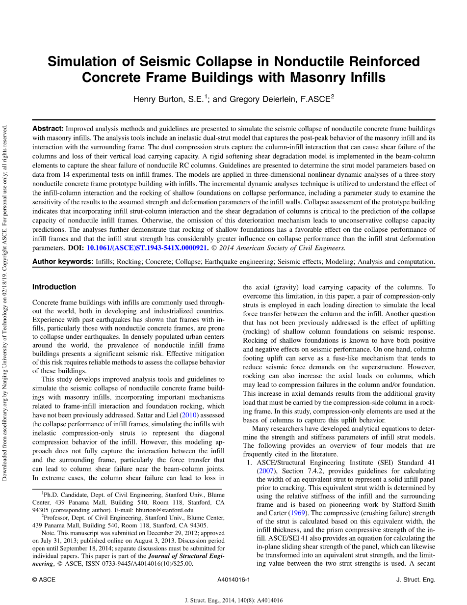 摘要:提出了用改进的分析方法和准则来模拟填充砖混结构框架结构的地震倒塌。分析工具包括一个非弹性双支柱模型,该模型捕捉了砌体填充物的峰后行为及其与周围框架的相互作用。双压杆能够捕捉柱与填充物的相互作用,从而导致柱的剪切破坏和竖向承载力的损失。在梁柱单元中建立了一个刚性软化剪切退化模型,以捕捉非延性钢筋混凝土柱的剪切破坏。根据14个填充框架试验数据,提出了确定支撑模型参数的准则。将该模型应用于带填充物的三层无延性混凝土框架原型建筑的三维非线性动力分析。利用增量动力分析技术来理解填充柱相互作用和浅基础的摇摆对塌陷性能的影响,包括参数研究,以检验结果对填充墙的假定强度和变形参数的敏感性。原型建筑的倒塌评估表明,考虑填充柱与柱的相互作用和柱的剪切退化是预测非延性填充框架倒塌能力的关键。否则,这种劣化机制的省略将导致非保守的倒塌能力预测。分析还表明,浅基础的摇摆对填充框架的倒塌性能有良好的影响,而填充支柱强度对填充性能的影响远大于填充支柱变形参数。DOI:10.1061/(ASCE)ST.1943-541X.0000921。2014美国土木工程师学会版权所有。