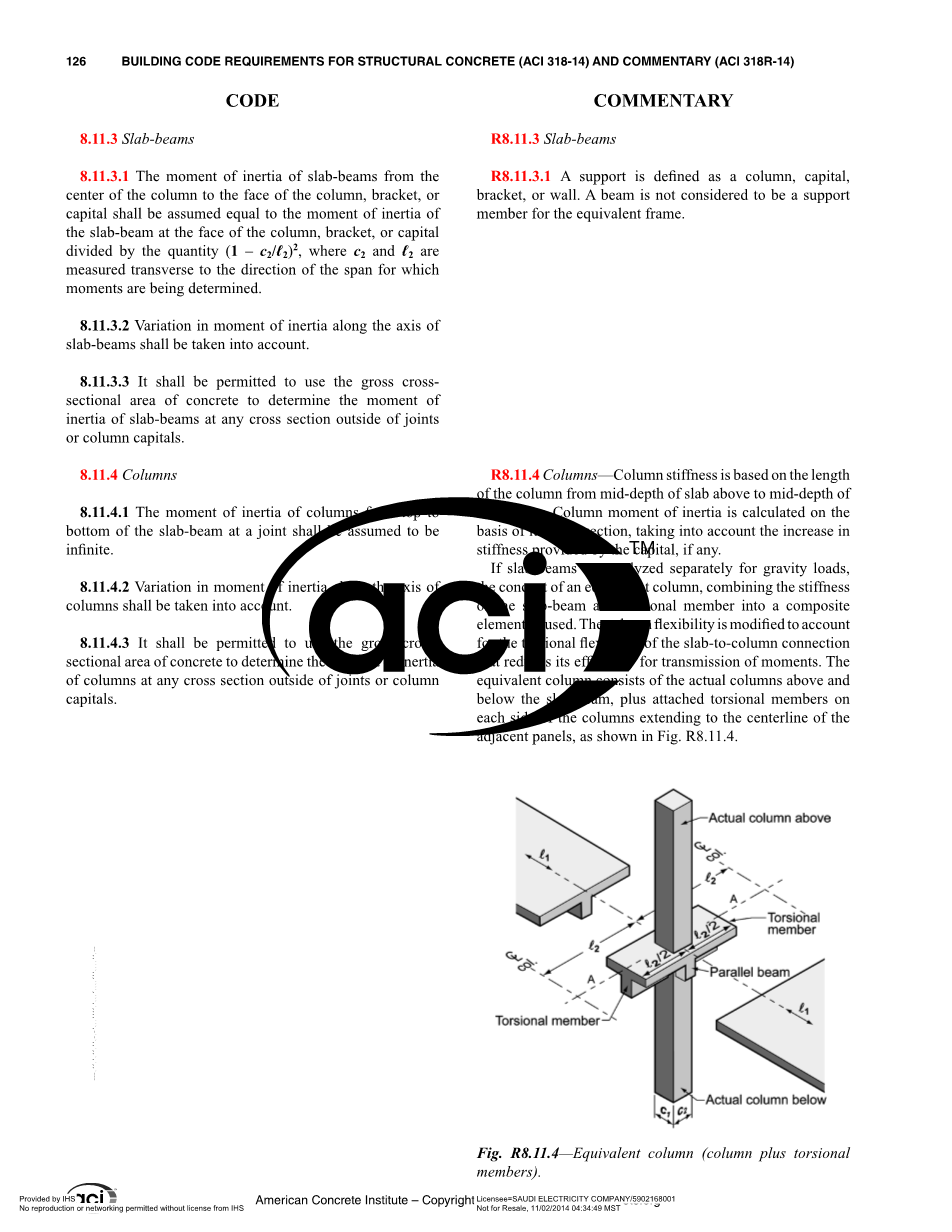 2. 如果在重力荷载下对板梁进行单独分析,则采用等效柱的概念,将板梁和受扭构件的刚度组合成一个组合单元。对柱柔度进行了修正,以考虑板柱连接的扭转柔度,从而降低了其传递力矩的效率。等效柱包括板梁上下的实际柱,以及柱两侧附加的、延伸至相邻板中心线的受扭构件,如图R8.11.4所示。
