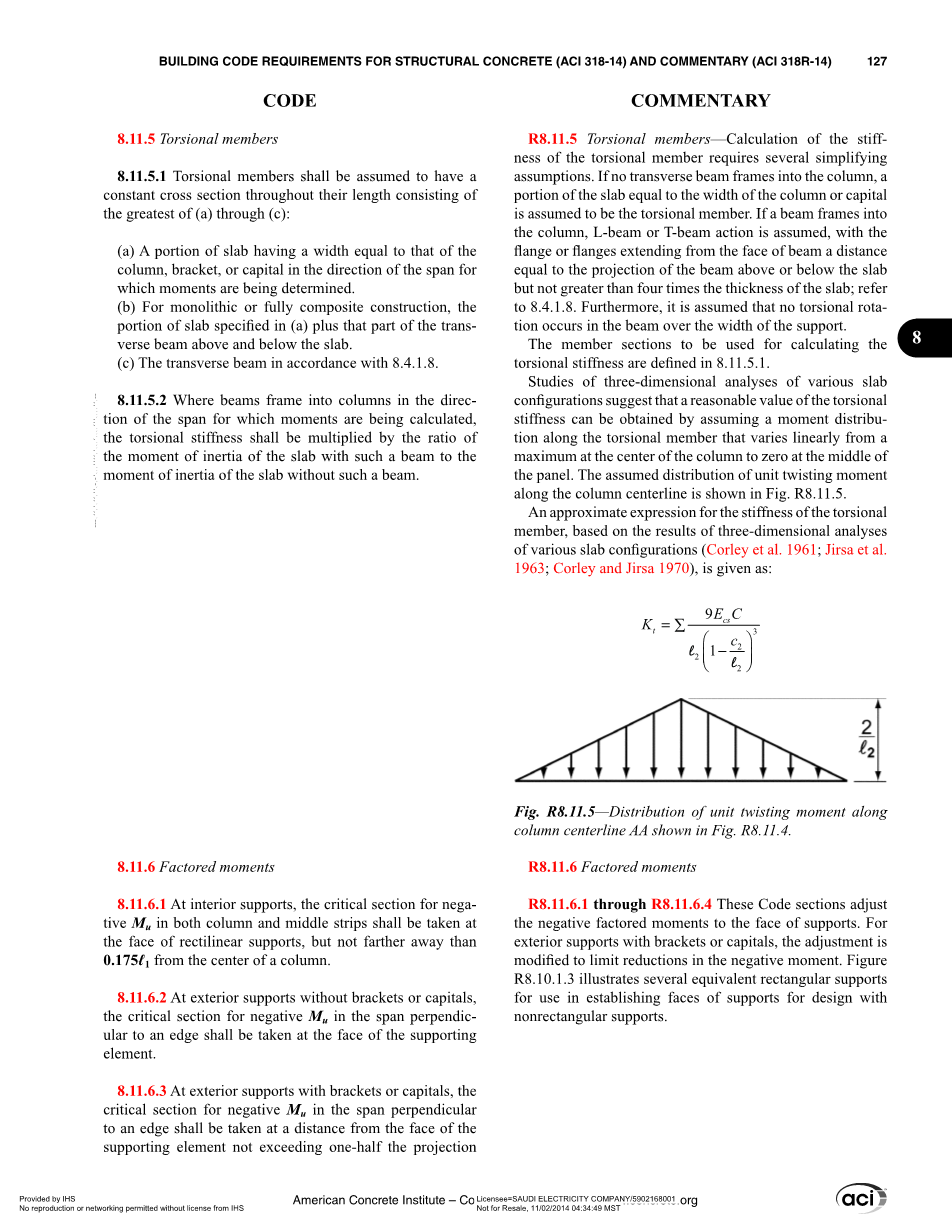 各种板配置的三维分析的研究表明,扭转刚度的合理值可以通过假设一个时刻,沿着线性变化的扭转成员最大的中心柱在面板中间的零。假定单位扭矩沿柱中心线分布如图R8.11.5所示。