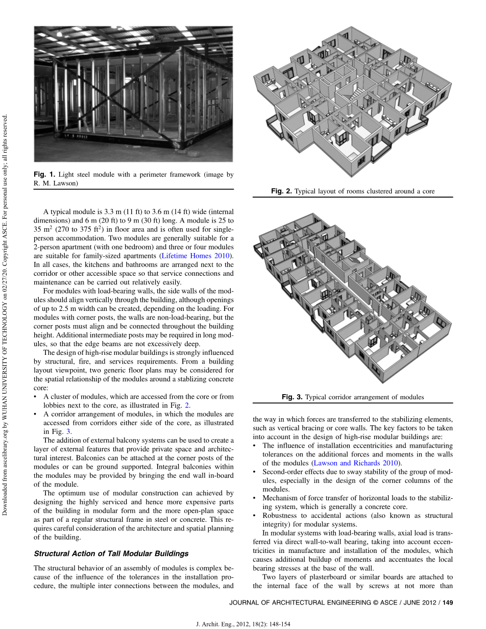 对于高层建筑,这些模块通常设计为仅抵抗垂直荷载,包括覆层和走廊荷载,而水平荷载则传递到混凝土核心。在群集布置中,将模块直接连接到核心区,通常将扎带连接到核芯中的铸件板上。在走廊布置中,水平载荷通过走廊中的平面支撑传递,并再次连接到核心区。因此,外部模块与核心区的距离受到由走廊传递的剪切力或出于疏散目的的行进距离的限制。