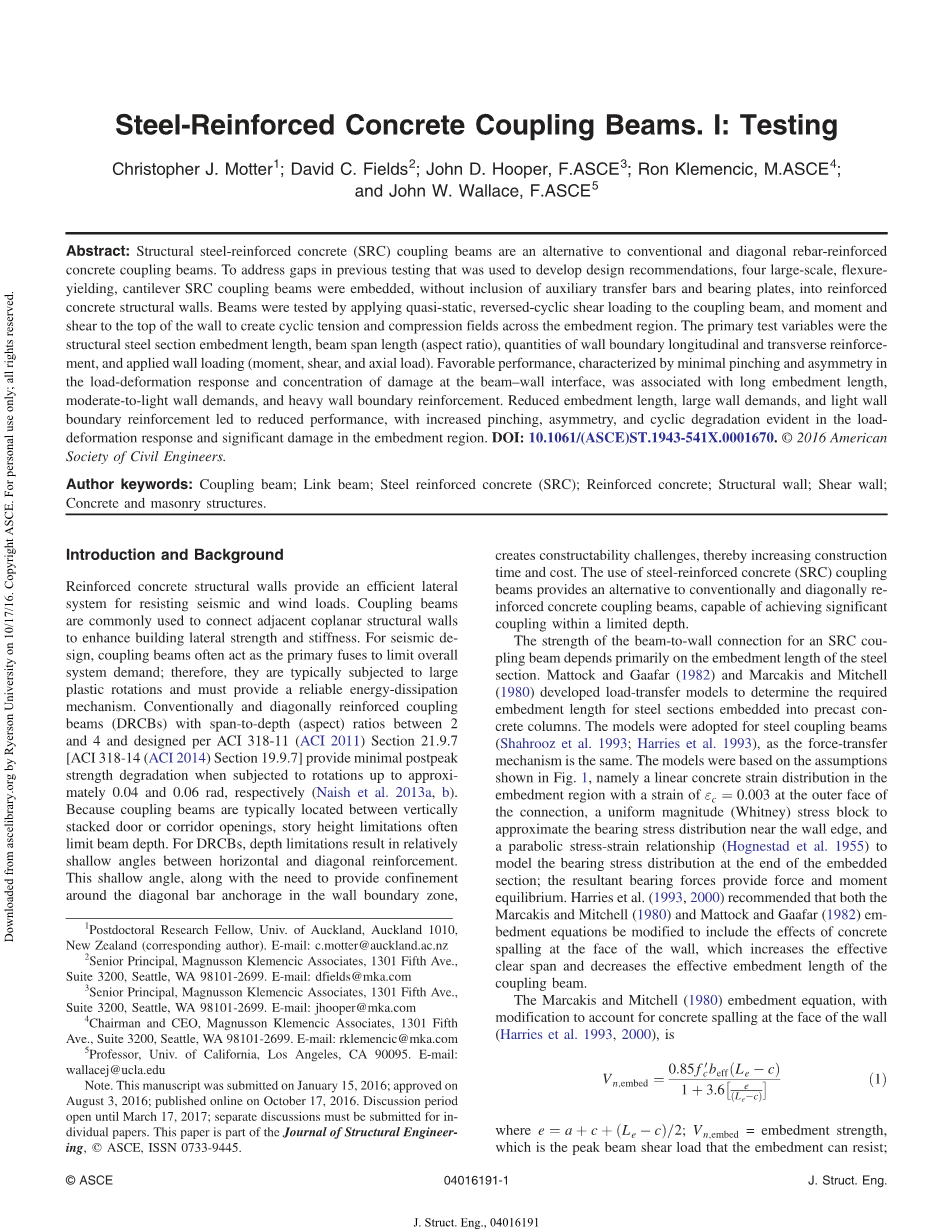 摘要:结构钢-钢筋混凝土(SRC)耦合梁是常规和对角钢筋混凝土耦合梁的替代方案。为了解决先前用于提出设计建议的测试中的空白,在钢筋混凝土结构墙中嵌入了四个大型的,弯曲屈服的,悬臂式SRC耦合梁,而没有包含辅助传递杆和支承板。通过对耦合梁施加准静态,反向循环剪切载荷,并对壁的顶部施加弯矩和剪切力,以在整个嵌入区域上产生循环拉伸和压缩场,对梁进行了测试。主要的测试变量是钢结构截面的包埋长度,梁跨度长度(长宽比),墙边界纵向和横向钢筋的数量以及施加的墙载荷(弯矩,剪切力和轴向载荷)。良好的性能,其特征在于,在荷载-变形响应中最小程度的收缩和不对称以及梁-墙界面处的损伤集中,这与较长的埋入长度,中等至轻的墙需求以及较重的墙边界加固相关。减小的嵌入长度,较大的壁需求和轻的壁边界加固导致性能降低,在载荷变形响应中明显增加了收缩,不对称和循环退化,并在嵌入区域造成了严重损坏。DOI:10.1061/(ASCE)ST.1943-541X.0001670.copy;2016美国土木工程师学会。
