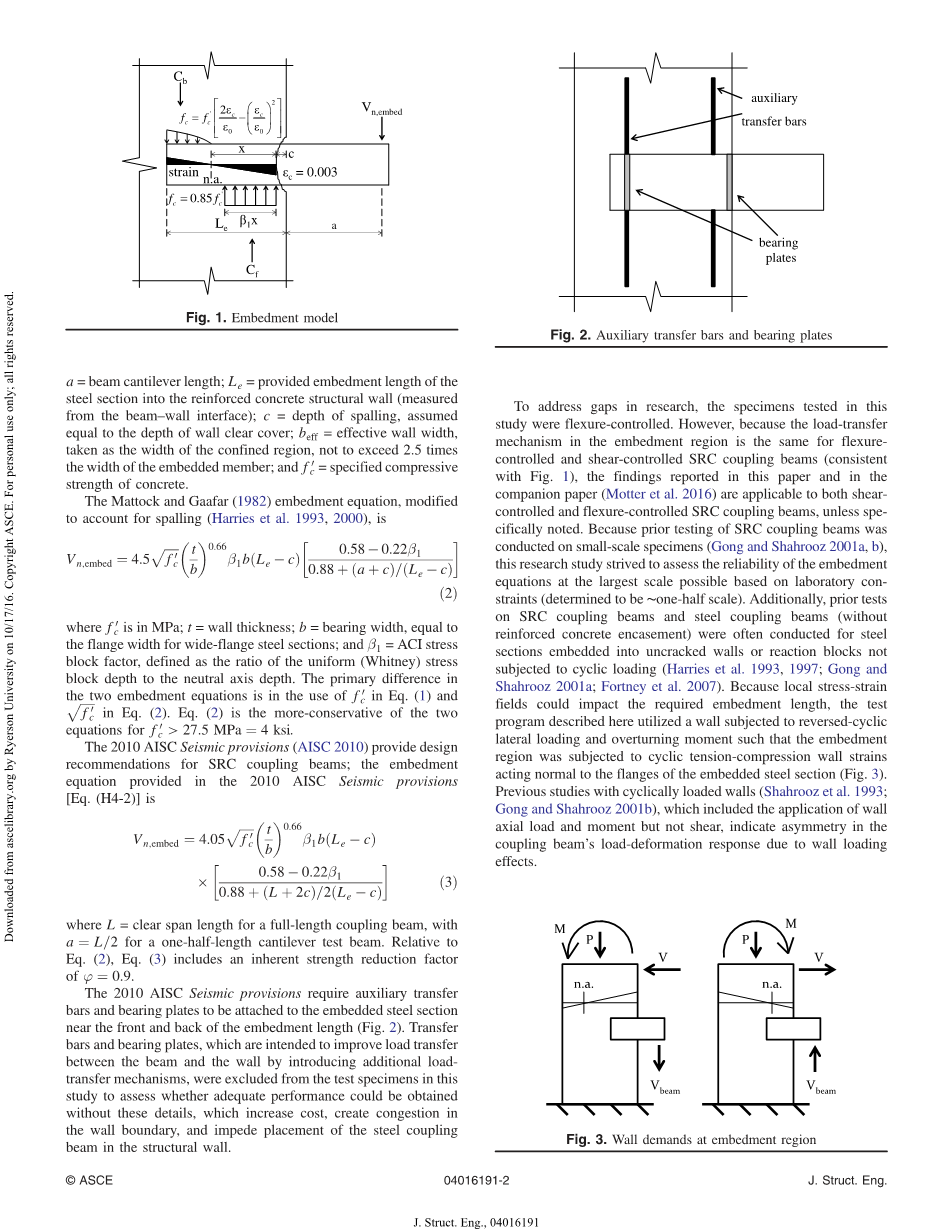 为了弥补研究中的空白,本研究中测试的标本是弯曲控制的。但是,由于对于挠曲控制和剪切控制的SRC耦合梁,埋入区域中的载荷传递机制相同(与图1一致),本 文件和随附文件(Motter等,2016)年除非另有说明,否则适用于剪切控制和挠曲控制的SRC耦合梁。因为先前对SRC耦合梁的测试是在小型标本上进行(龚和沙鲁兹2001a, b),本研究致力于根据实验室约束条件(确定为约一半的规模),以最大的规模评估嵌入方程的可靠性。此外,以前的对于SRC耦合梁和钢耦合梁(无钢筋混凝土包装),通常对埋入未开裂的墙或未承受周期性荷载的反应块的钢制截面进行测试(Harries等.1993年, 1997; 龚和 沙鲁兹2001a,b) 因为局部应力应变字段可能会影响所需的嵌入长度,测试此处描述的程序利用了承受逆循环的壁侧向荷载和倾覆力矩使得嵌入区域承受循环拉伸-压缩壁应变垂直于嵌入式钢型材的法兰作用(图3)。以前对循环荷载墙的研究(Shahrooz 等,1993; Gong和Shahrooz 2001b),其中包括墙的应用轴向载荷和力矩而不是剪切力,表明在墙荷载作用下耦合梁的荷载变形响应效果。