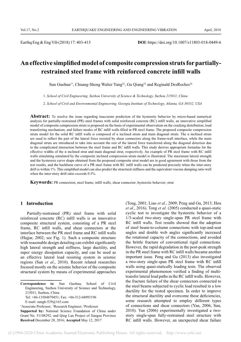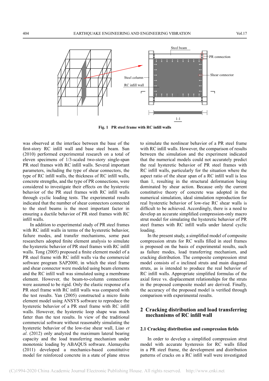 PR钢框架加RC填充墙的滞回性能、破坏模式、传递机理等方面的试验研究,过去的一些研究人员采用有限元分析的方法来模拟PR钢框架加RC填充墙的滞回性能。Tong(2005)通过商业软件SAP2000提出了钢筋混凝土填充墙PR钢框架的有限元模型,其中钢框架和剪力连接器采用梁单元建模,钢筋混凝土填充墙采用mmbrane单元模拟。然而,梁柱之间的连接被认为是刚性的。本文仅对钢筋混凝土填充墙PR钢框架的弹性响应与试验结果进行了比较。Yan(2005)利用ANSYS软件建立了微型有限元模型,再现了钢筋混凝土填充墙PR钢框架的滞回性能。然而,滞回曲线形状比试验结果要大得多。Liao等(2012)针对传统商业软件没有合理模拟低层剪力墙的滞回行为,仅利用ABAQUS软件分析了单调荷载作用下的最大侧向承载力和荷载传递机制。Alemayehu(2011)提出了一种基于力学的钢筋混凝土平面应力状态下的本构模型,用以模拟具有钢筋混凝土填充墙的PR钢框架的非线性行为。然而,仿真与实验结果的比较表明,数值模型无法准确预测真正的公关钢框架的滞回行为与钢筋混凝土填实墙,尤其是对长宽比的情况下的剪跨钢筋混凝土填实墙小于1,导致结构变形是由剪切动作。由于数值模拟中只采用了现行的混凝土本构理论,难以实现对低层剪力墙真实滞回行为的理想模拟再现。因此,有必要建立一个精确的、简化的、只考虑压缩的宏观支撑模型来模拟PR钢框架在横向循环荷载作用下的滞回性能。