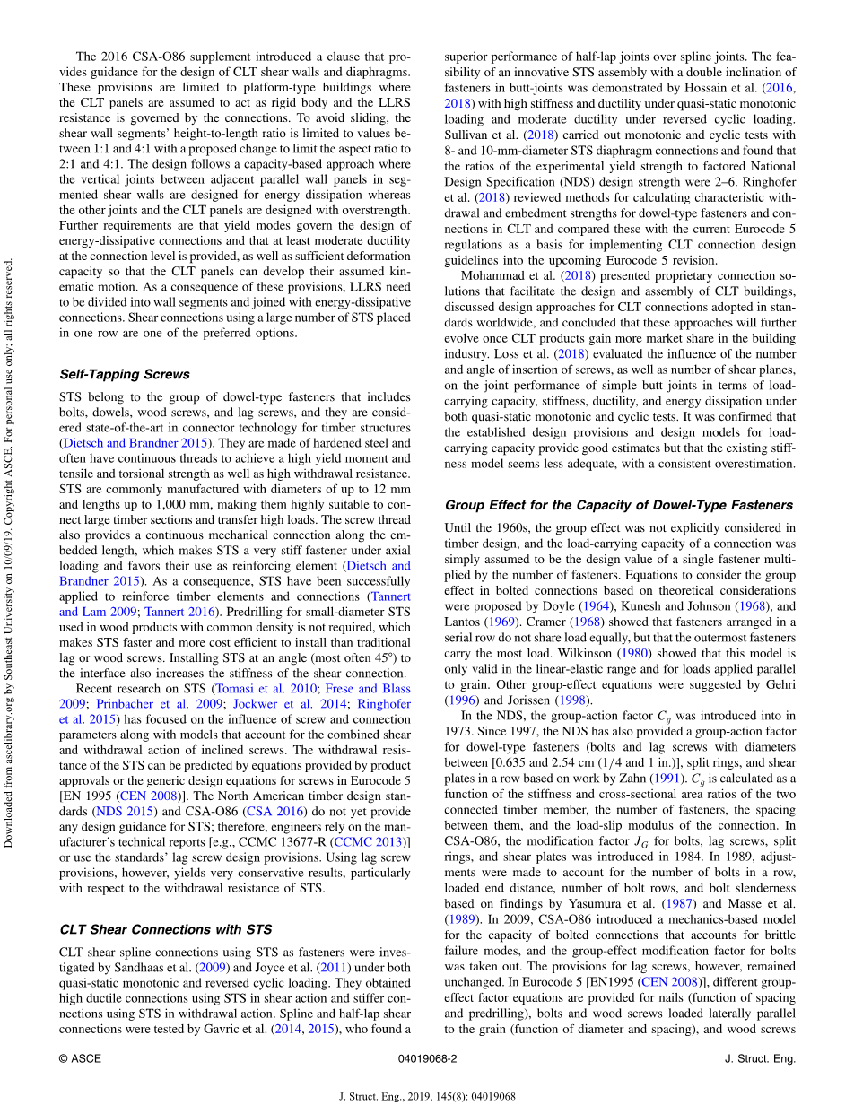 自攻螺钉的最新研究,重点研究了螺杆和连接参数的影响,以及考虑斜螺杆剪切和拉拔连接作用的模型。自攻螺钉的抗拔性可以通过欧洲规范5 [EN 1995 (CEN 2008)]中产品批准提供的公式或螺钉通用设计公式来预测。北美木材设计标准(NDS 2015)和CSA- o86 (CSA 2016)尚未对自攻螺钉提供任何设计指导;因此,工程师们依赖于制造商的技术报告。 [CCMC 13677-R (CCMC 2013)]或使用标准的拉力螺杆设计规定。然而,使用滞后螺杆的规定,产生非常保守的结果,特别是关于自攻螺钉的收缩阻力。