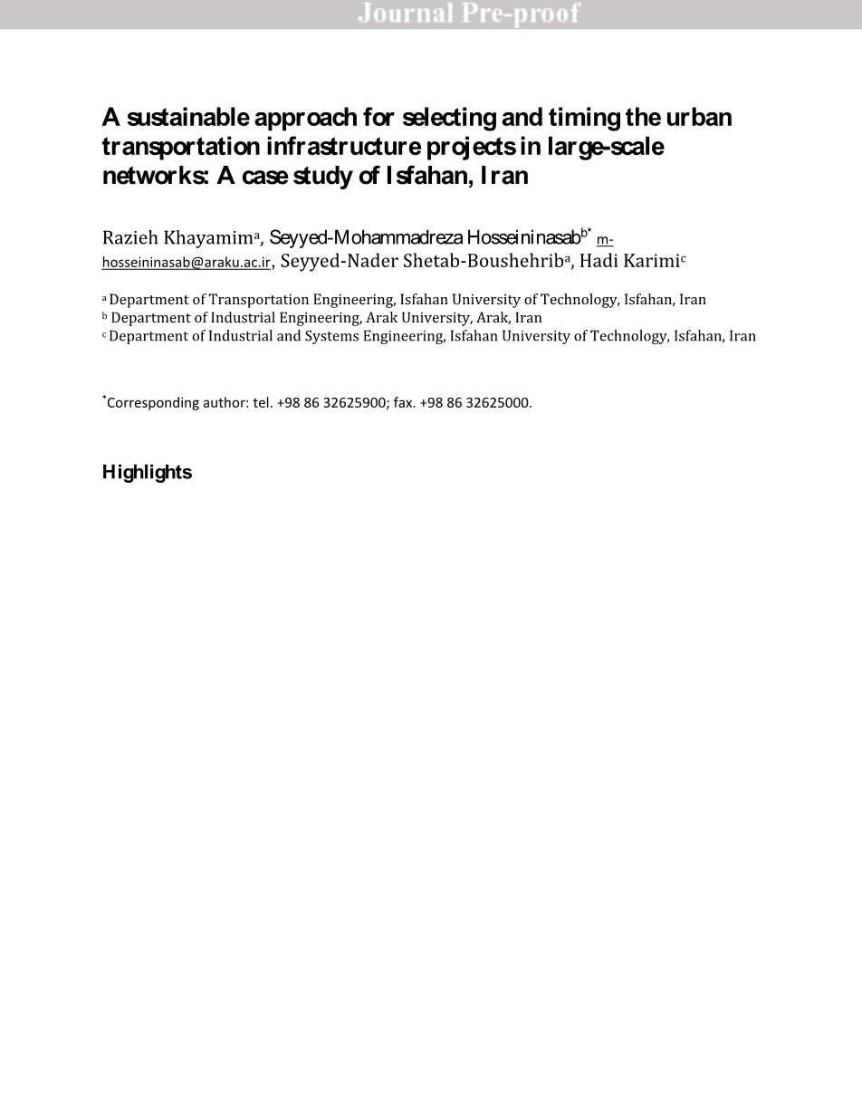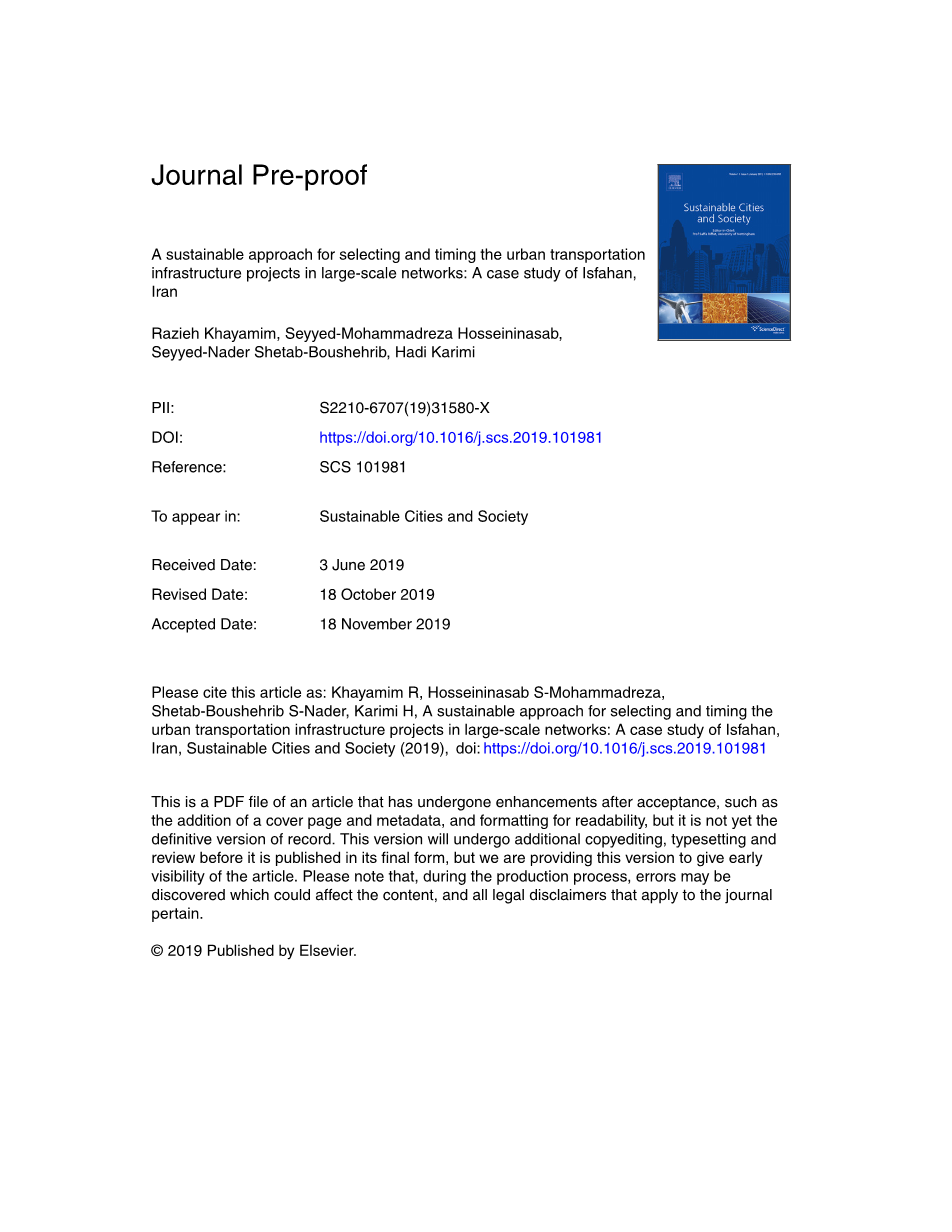 请引用本文为:Khayamim R,Hosseininasab S-Mohammadreza,Shetab Boushehrib S-Nader,Karimi H,大型网络中城市交通基础设施项目选择和时间安排的可持续方法:伊朗伊斯法罕可持续城市与社会案例研究(2019),DOI: https://doi.org/10.1016/j.scs.2019.101981