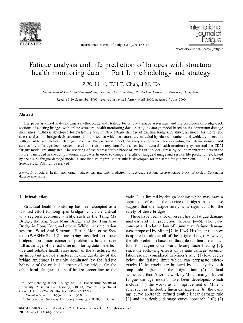 结构健康监测已经被接受作为对已经成为一个地区至关重要的经济活力的大跨度桥梁的合理的方法成果,比如青马桥的设计和在香港和其他的地方的汲水门大桥和汀九桥大桥。当仪表系统,风和结构健康监测系统(WASHMS)[1,2]被安装在这些桥梁上,共同关注的问题是如何充分利用实时监测数据进行有效、可靠的结构健康评估。桥梁结构的耐久性作为桥梁结构健康的重要组成部分,主要受桥梁的疲劳性能的控制。另一方面,根据设计荷载,桥梁疲劳设计受对桥梁的疲劳性能有着重要的影响的设计荷载的限制[3]。这些结果表明,疲劳分析对这些桥梁的安全性有着重要意义。
