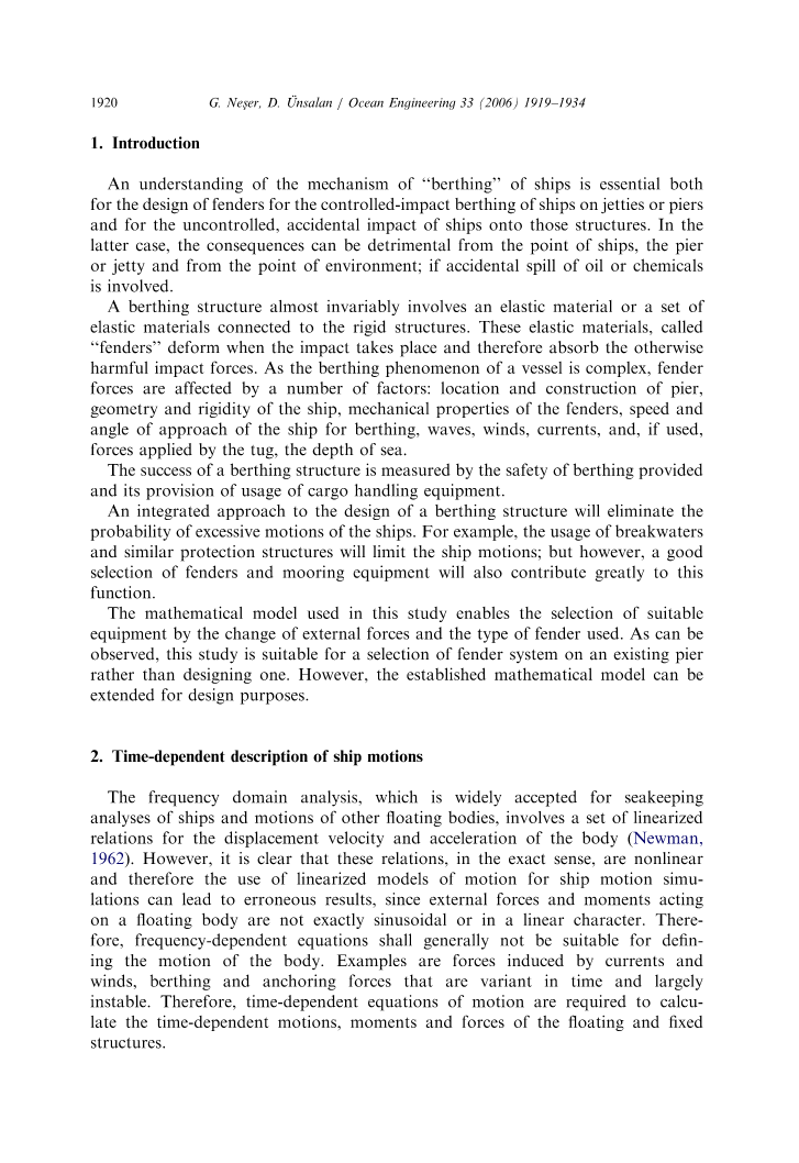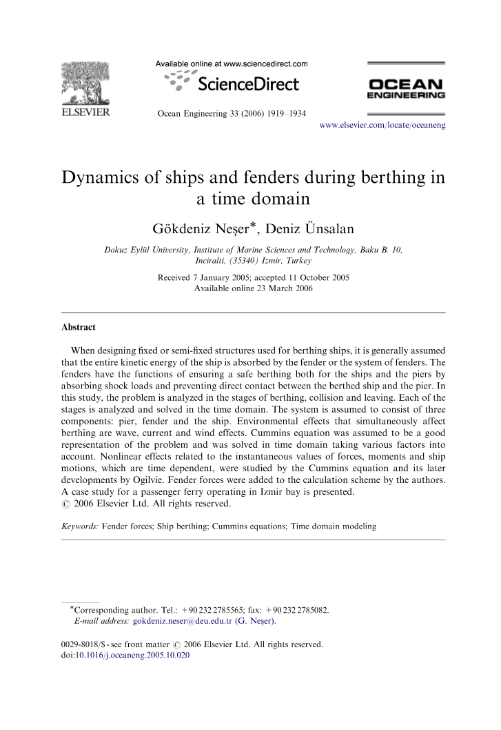 当设计用于系泊船舶的固定或半固定结构时,通常假定整个船的动能是被护舷或护舷系统吸收了。护舷的功能是通过吸收冲击载荷和防止停泊的船和码头之间的直接接触来确保一个船只和码头的安全的停泊。在这项研究中,问题是停泊的阶段,分析了碰撞和分离。用时域分析来分析每个阶段。假设系统由三个部分组成:码头,护舷和船舶。影响停泊的环境影响考虑浪流和风力的同时影响。Cummins方程被假定为一个好的问题表征,解决了在时域考虑的各种因素。非线性效应与力的瞬时值, 是与时间有关的时刻和船舶运动, 通过Cummins方程进行了研究及其以后Ogilvie的发展。作者的计算方案添加了护舷反力。研究了一艘客船在伊兹密尔湾操作的一个案例。