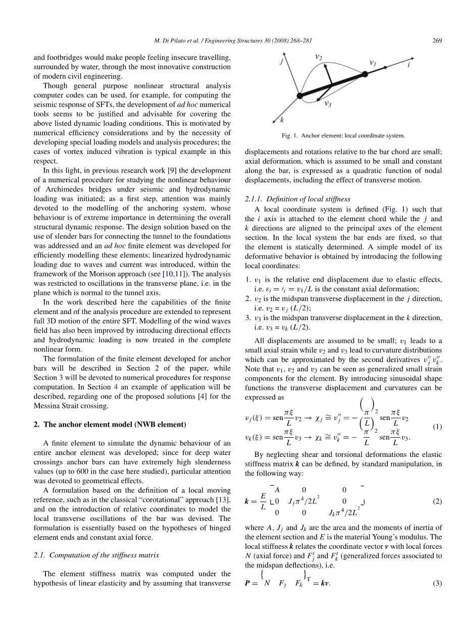 有鉴于此,在以前的研究工作中[9]数值程序为研究地震作用下和水动力荷载阿基米德桥的非线性特性开发已启动;作为第一步,注意力主要致力于锚固系统,其行为是极端重要在确定整体结构动态响应的建模。设计解决方案以使用细长杆连接的隧道为基础,解决了一个特设的有限元,有效地模拟这些元素;介绍了线性水动力载荷由于波和电流,在莫里森方法的框架(见[10,11])。分析垂直于隧道轴线的平面被限制在横向平面的振荡。