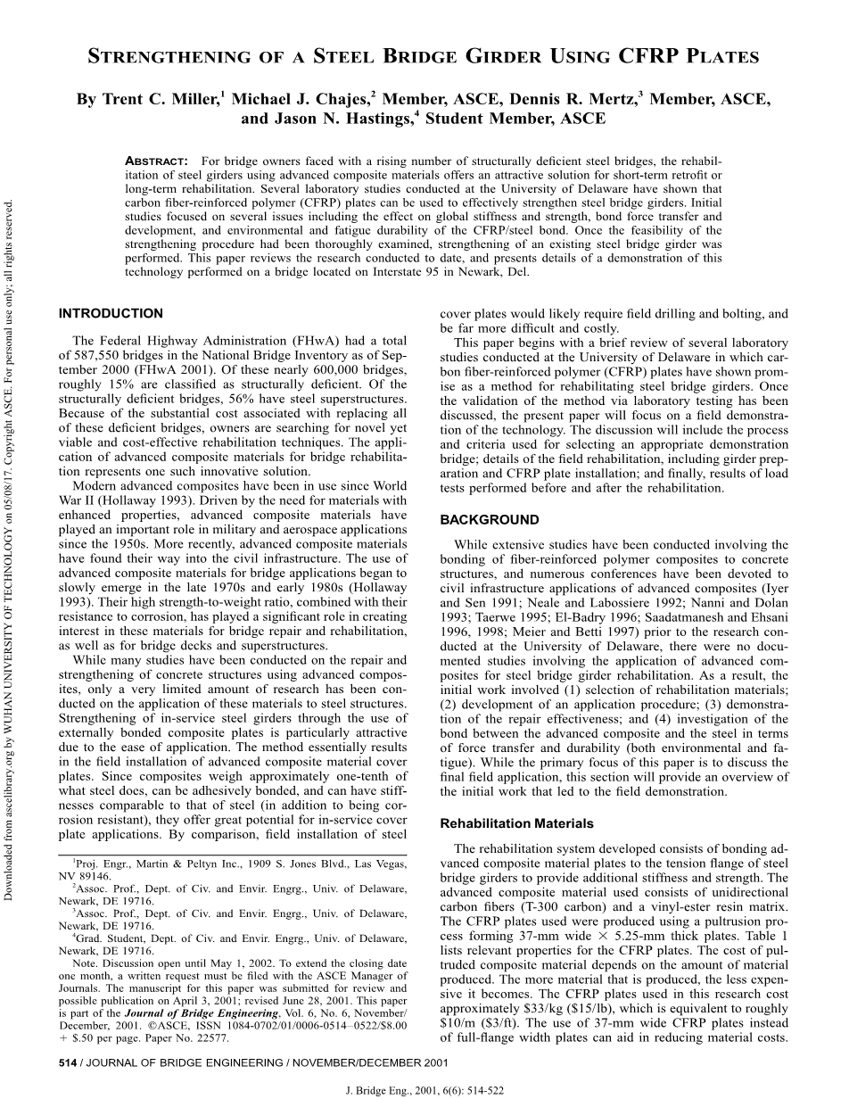作者:Trent C. Miller,1 Michael J. Chajes,ASCE的2名成员,ASCE的3名成员Dennis R. Mertz,和ASCE的4名学生成员Jason N. Hastings