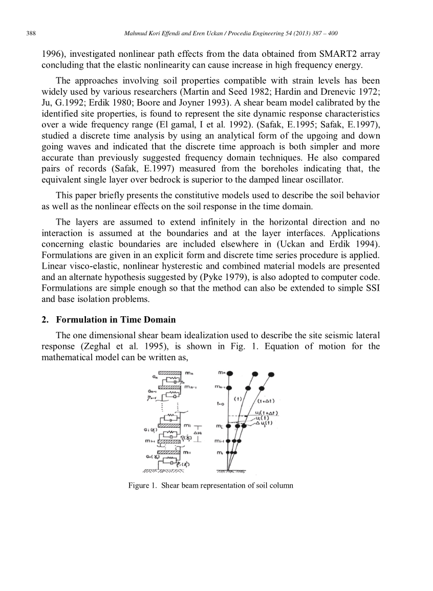 在过去十年中,通过钻孔记录提供的强运动数据的增加,人们特别注意了对土层的非线性动力学响应的分析。1995,Satoh T.等人将强震主要部分的峰值与弱震的那些峰值进行比较,得出结论:剪切模量随着有效剪切应变水平的降低而迅速恢复。Beresnev 在1995和1996年,调查研究从SMART2阵列获得的数据的非线性路径效应,结论是弹性非线性可导致高频能量的增加。涉及与应变水平相容的土壤性质的方法已被各种研究者广泛使用(Martin和Seed 1982;Hardin和Drenevic 1972;Ju,G.1992;Erdik 1980;Boore和Joyner 1993)。1992年,El gamal,I等人,发现通过识别的场地性质校准的剪切梁模型表示了宽频率范围内的场地动态响应特性。Safak,E.在1995年和1997年通过使用上行和下行波的分析形式来研究离散时间分析,并且指示离散时间方法比先前建议的频域技术更简单和更准确。1997年他还比较了从钻孔测量的成对记录,表明基岩上的等效单层优于阻尼线性振动器。