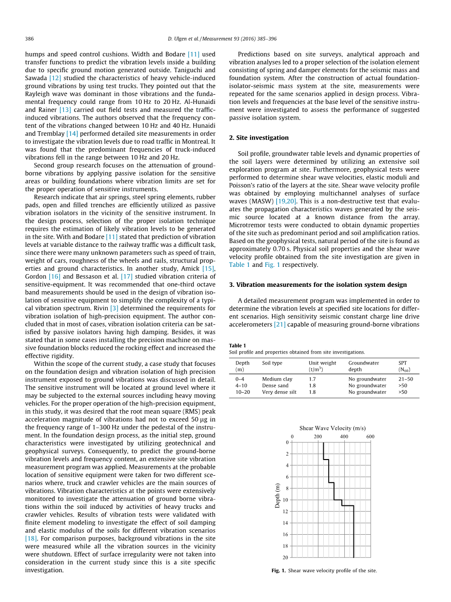 研究表明,空气弹簧、钢板弹簧元件、橡胶垫、开放和填充式沟槽被有效的用作敏感仪器附近的被动隔振器。在设计过程中,选择正确的隔离技术需要推测在现场可能发生的振动水平。With和Bodare[11]指出,预测轨道交通不同距离的振动水平是一项艰巨的任务,因为有很多未知的参数如火车的速度、车的重量、车轮和钢轨的表面粗糙度、结构特性和地面特征。在另一项研究中,Amick[15], Gordon[16]和Bessason等人[17]研究了敏感设备的振动标准。有人建议,在敏感设备的隔振设计中应使用三分之一倍频程测量来简化的典型振动频谱的复杂性。Rivin[3]将这确定为高精密设备隔振的要求。笔者认为,在大多数情况下,隔振的条件可以通过具有高阻尼的被动隔振器来满足。此外,有人指出,在某些情况下,将精密机械安装在大基础上可降低摇摆效应,并增加有效刚度。在本研究中,一个着重于暴露于地面振动下的高精度仪器的隔震器与基础设计的研究案例被进行了详细讨论。敏感仪器将被安放在可能受包括移动的重型车辆在内的外界振源的影响的地表。在这项研究中,对于高精度设备的正确操作要f风f仪器基座下的振动加速度峰值大小的均方根(RMS)在1-300赫兹的频率范围内不超过50mu;g。在基础设计过程中,作为初始步骤,利用岩土工程和地球物理调查,对地面特性进行了研究。因此,为了预测地面传播的振动水平和频率,广泛的现场振动测量计划被投入了使用。在可能安放敏感设备的位置,进行以卡车或履带车辆的振动为主要来源的两种不同情况下的测量。广泛的点的振动特性的监测被实施,以调查由重型卡车和履带车辆的活动引起的土壤内振动传播的衰减。通过有限元建模考虑土壤阻尼和土的弹性模量的影响来模拟不同的振动场景使振动试验的结果得到了验证[18]。为了对比的目的,所有在附近的振动源都被关闭,并在现场背景的振动中进行测量。表面不规则性的影响没有考虑到在目前的研究中,因为这是一个特定的现场调查。