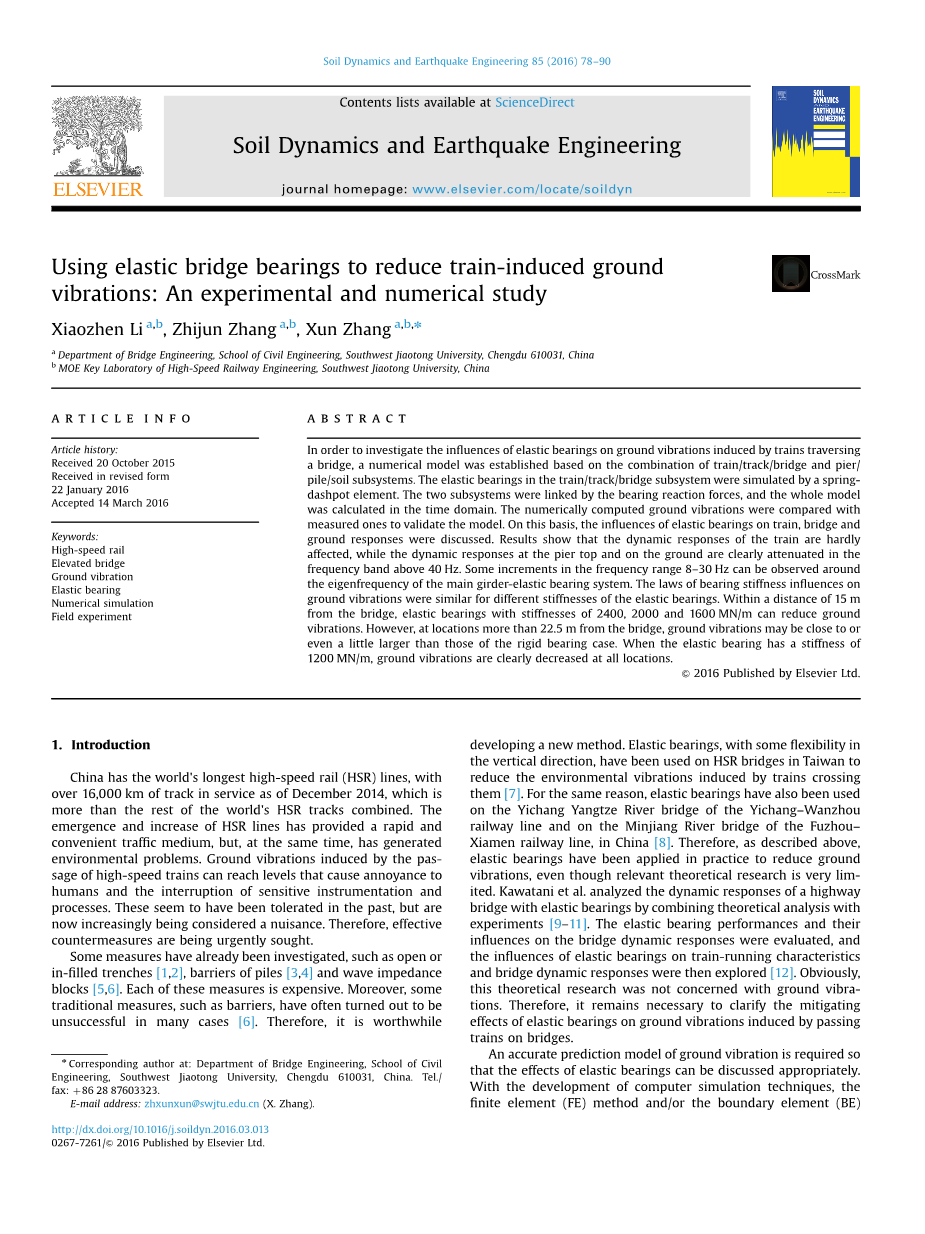 关键词:高速铁路;高架桥;地面振动;弹性支座;数值模拟;现场试验
