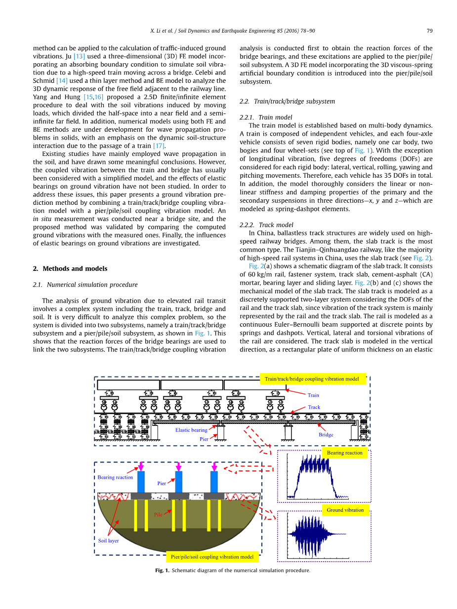 现有研究主要采用土体中的波传播并且已经得出一些意义重大的结论。然而,列车和桥梁之间的耦合振动通常以一个简化模型被考虑于研究中,并且弹性支座对地面振动的影响并未被研究。为了去应对这些问题,本文通过结合车-线-桥耦合振动模型和墩-桩-土耦合模型,提出一种地面振动预测模型。在一个桥址附近,进行了一个原位试验,并且通过对比地面振动的计算值和测量值验证了该方法。最后,研究了弹性支座对地面振动的影响。