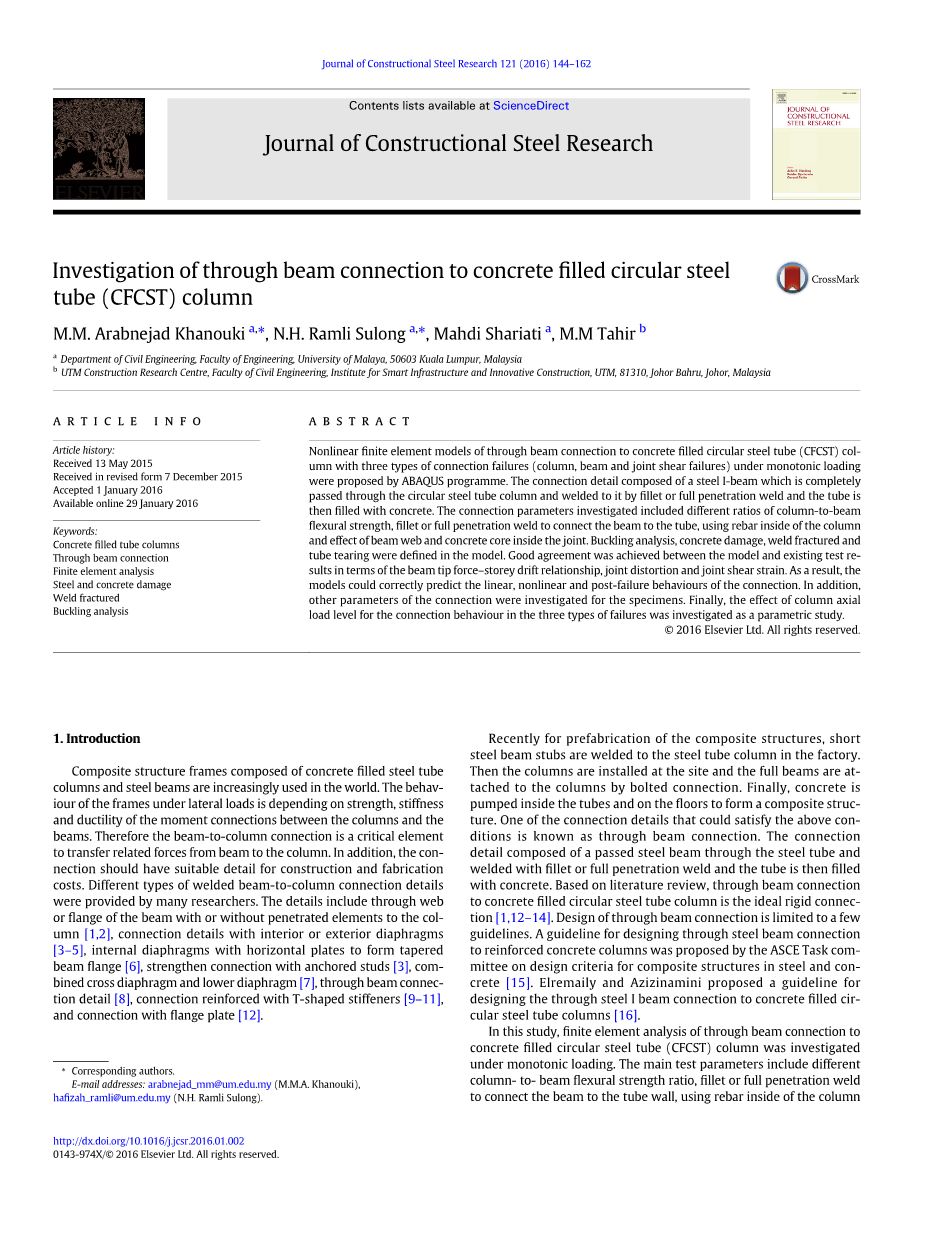 连续梁与钢管混凝土柱连接在在单调负载下有三种类型的连接破坏(柱,梁和连接处剪切破坏),而它们的非线性有限元模型是由ABAQUS项目提出的。连接细部由钢制I形梁与圆形钢管柱通过角焊缝或全熔透焊缝焊接而成,接着再向管内充满混凝土。所研究的连接参数包括不同的柱梁弯曲强度比率,角焊缝或全熔透焊缝使用钢筋内部的钢筋,以及在接头内的梁腹板和混凝土芯的作用将梁连接到管。模型中定义了屈曲分析,混凝土破坏,焊缝断裂和管撕裂。该梁柱模型与有关梁尖端应力–层间位移关系,节点变形和节点剪切应变方面的实验数据达成了良好的一致性。因此,该模型可以正确地预测连接处的线性,非线性表现以及可能出现的破坏。此外,连接处的其它参数也作为样本进行了研究。最后,对梁柱连接处的竖向荷载大小在三种类型的失效连接行为中的影响进行了参数研究。