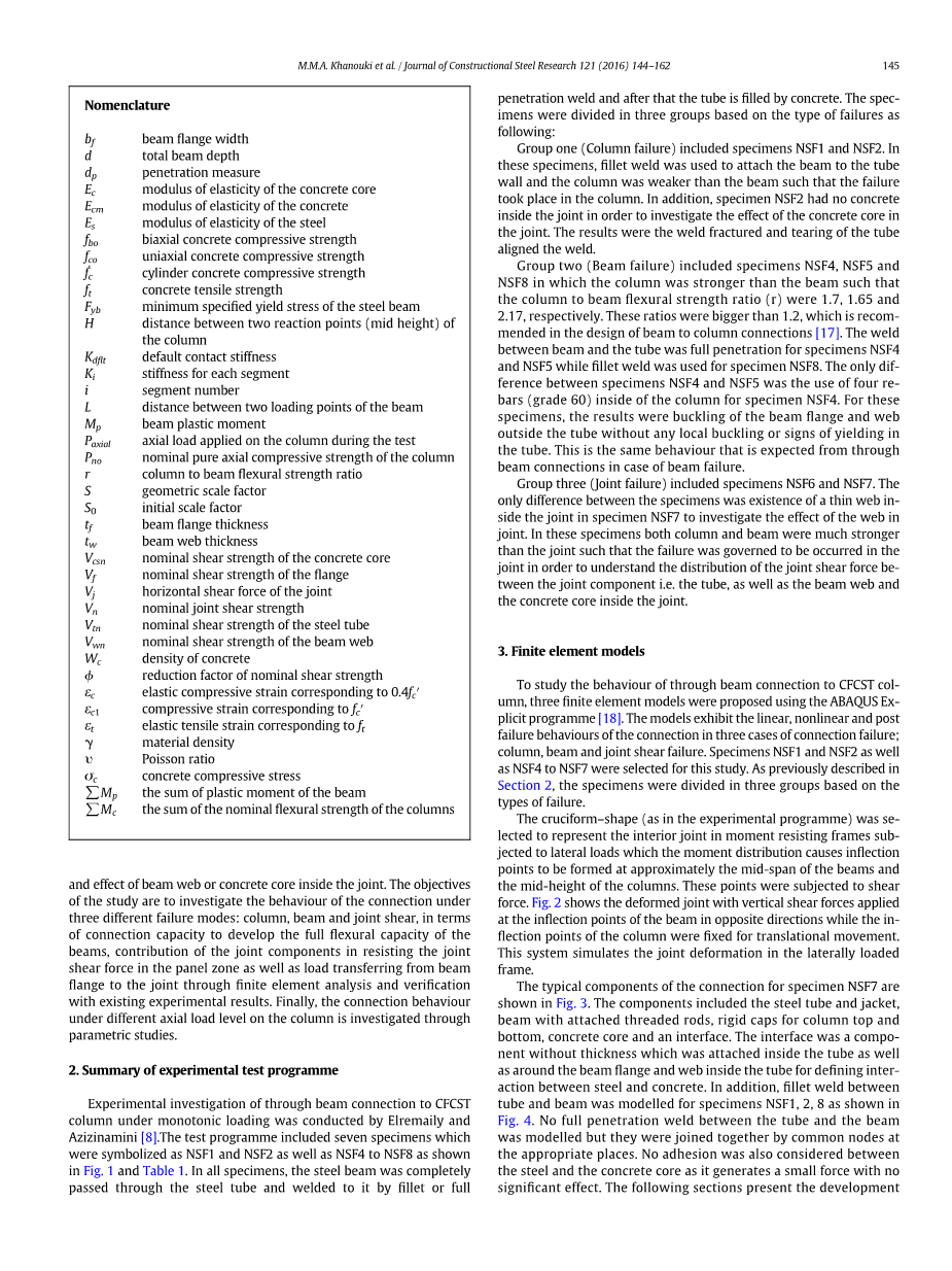 第一组(柱破坏)包括试件NSF1和NSF2。 在这些试件中,角焊缝用于将梁连接到管壁,并且柱比梁弱以至于使柱发生破坏。此外,试件NSF2在连接处内没有混凝土,用以研究混凝土芯在连接处的影响,结果是角焊缝断裂和对焊缝的撕裂。
