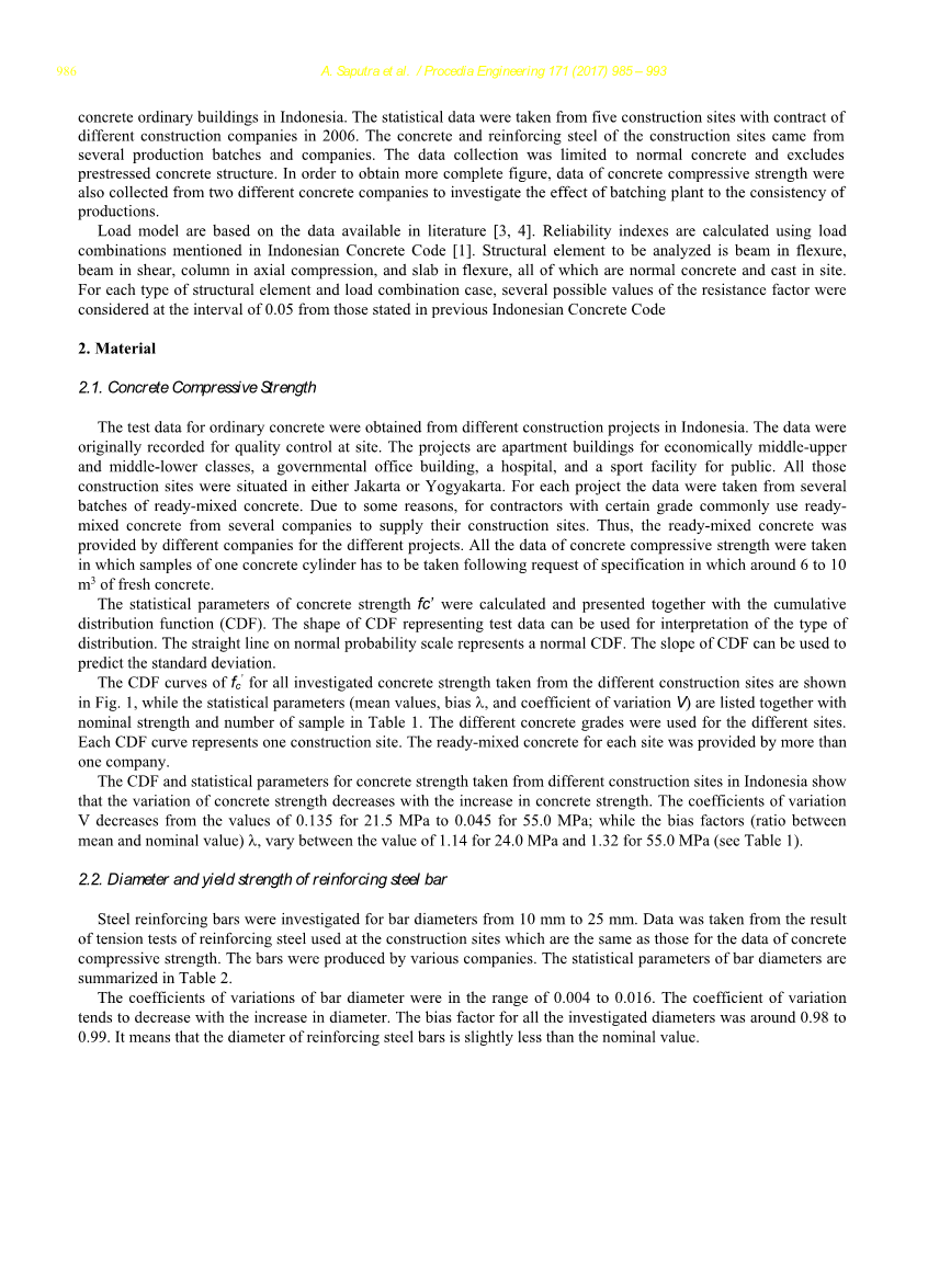 这篇论文介绍印尼的普通钢筋混凝土的材料统计特性和结构构件的制造。这些统计数据取自2006年不同建筑公司的五个建筑场地。建筑场地的混凝土和钢筋取自几个生产批次和公司。数据采集仅限于普通混凝土,不包括预应力混凝土结构。为了获得更完整的数据,还收集了两个不同混凝土公司的混凝土抗压强度数据,以研究配料厂对产品一致性的影响。
