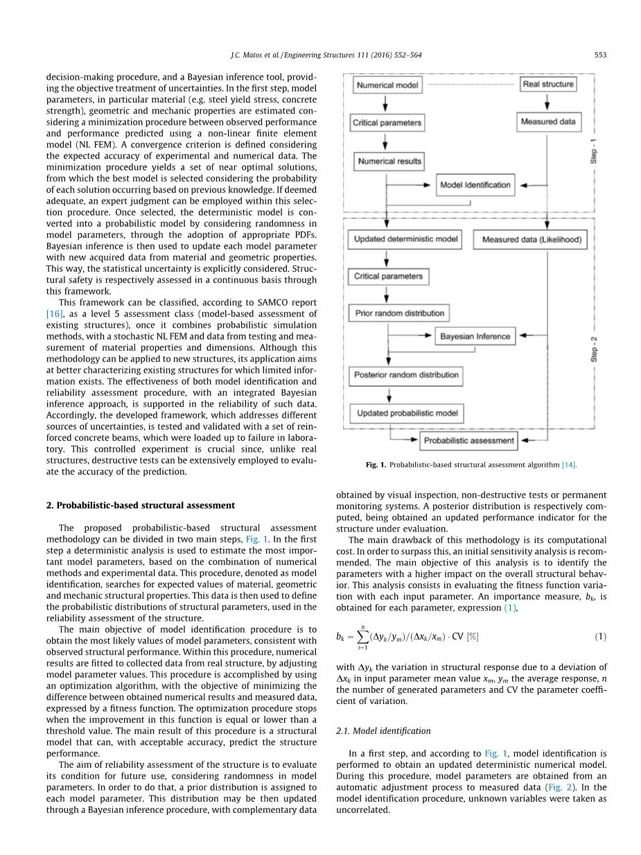 在本文中,一个基于概率的新框架介绍了现有结构的结构评估。这个框架结合了一些结构评估技术概述了一种新的方法来确定最优解决方案,基于进化算法和混合程序,以及贝叶斯推理工具客观对待不确定因素。在第一步,模型参数,特别是材料(例如钢屈服应力,混凝土强度),考虑几何和力学性质观察表现之间的最小化程序并使用非线性有限元预测性能模型(NL FEM)。考虑到收敛标准,预期实验和数值数据的准确性。该最小化程序产生一组近似最优解,考虑到概率,选择最佳模型。基于以前的知识发生的每个解决方案。如果被视为在此选择中可以采用足够的专家判断程序。一旦选择,确定性模型被转换。通过考虑随机性进入概率模型模型参数,通过采用适当的PDF,然后使用贝叶斯推理来更新每个模型参数从材料和几何属性获取新的数据。