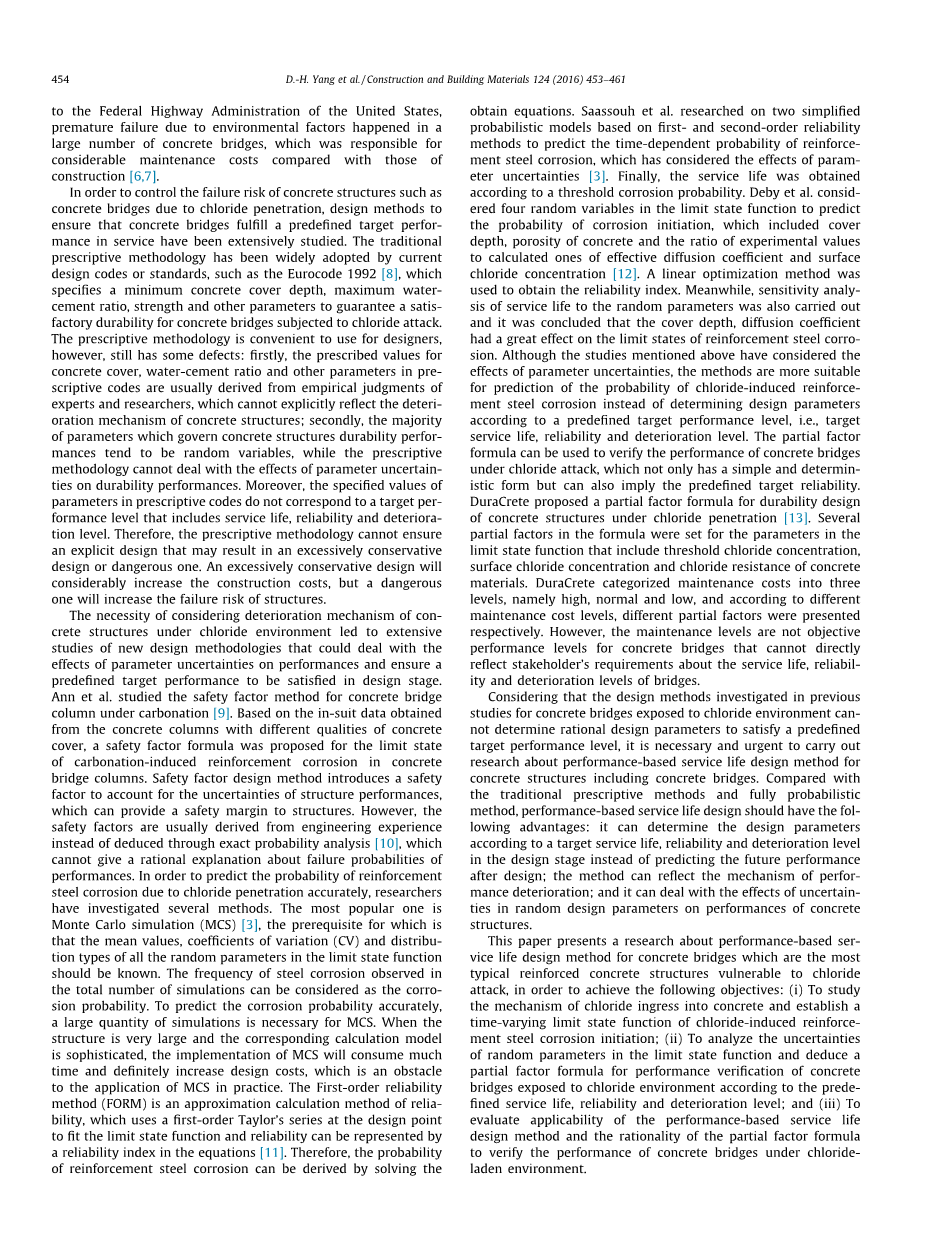 本文提出了一种基于性能的混凝土桥梁使用寿命设计方法的研究,这是混凝土桥梁最容易受到氯化物侵蚀的最典型的钢筋混凝土结构,以达到以下目标:(i)研究氯化物进入混凝土的机理,建立氯化物强化钢腐蚀开始的时变极限状态函数;(ii)分析极限状态函数中随机参数的不确定性,并根据预定的使用寿命,可靠性和劣化程度,推导出暴露于氯化物环境的混凝土桥梁性能验证的部分因子公式;(iii)评估基于性能的使用寿命设计方法的适用性和部分因子公式的合理性,以验证氯化物环境下混凝土桥梁的性能。