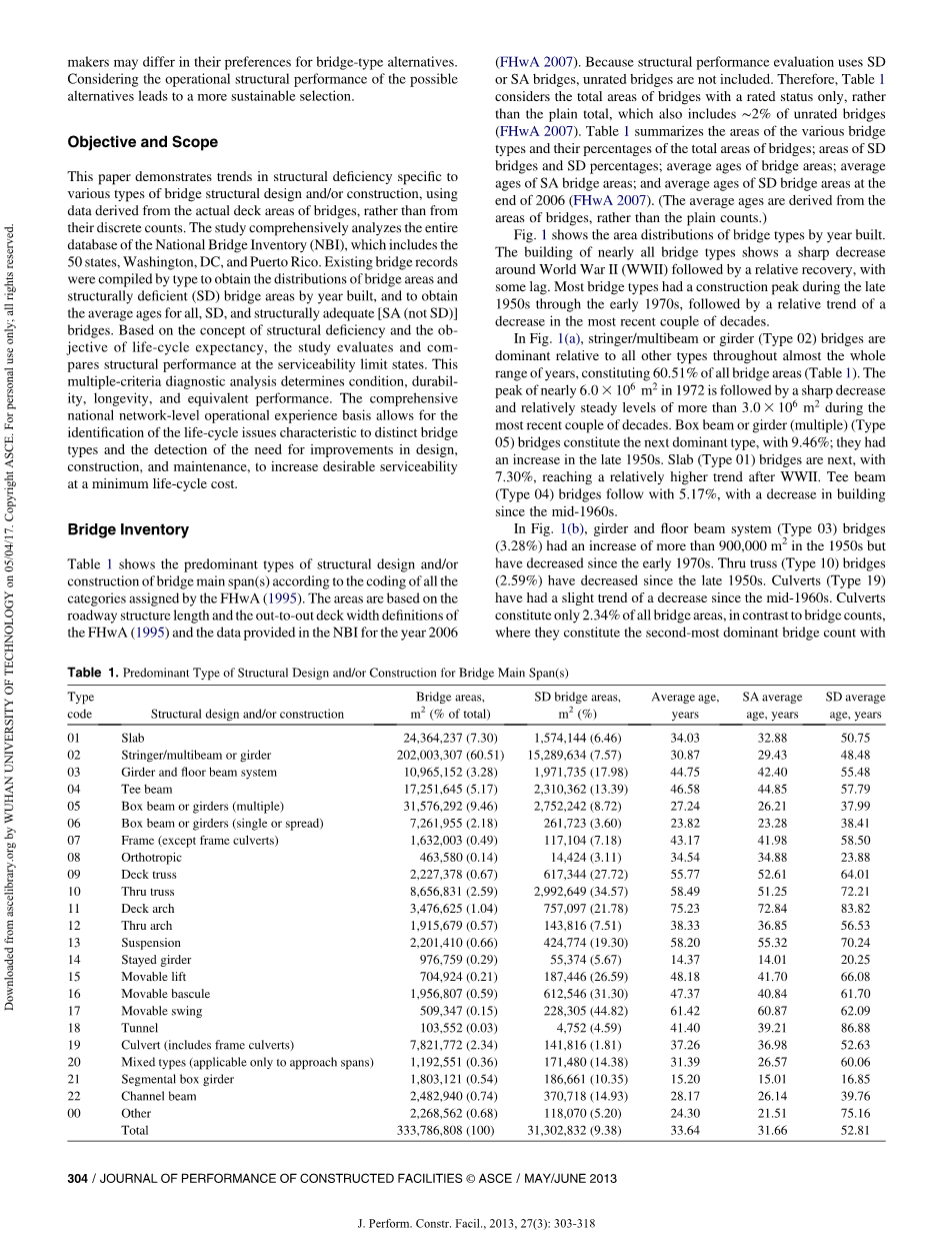 表1显示了根据FHwA(1995)分配的所有类别的编码,桥梁主跨的主要结构设计和构造类型。这些区域基于FHwA(1995)的巷道结构长度和外部甲板宽度定义以及2006年NBI提供的数据(FHwA 2007)。由于结构性能评估采用SD或SA桥梁,不包括未分级桥梁。因此,表1考虑了只有额定状态的桥梁总面积,而不是平原总面积,其中还包括2%的未分级桥梁(FHwA 2007)。表1总结了各种桥梁类型的面积及其占桥梁总面积的百分比;SD桥梁面积和SD百分比;桥面平均年龄;SA桥区平均年龄;和2006年底SD桥区平均年龄(FHwA 2007)。(平均年龄来源于桥梁的面积,而不是普通的数量)。