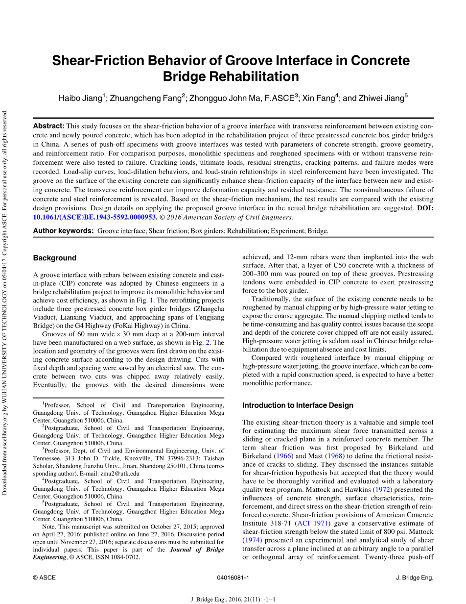 关键词:沟槽界面;剪切摩擦;箱形桥梁;加固;实验;桥梁