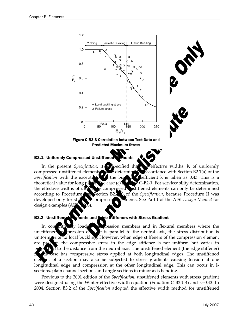 在本说明书中,规定均匀受压的非加强板件的有效宽度b可以根据说明书的第B2.1(a)节确定,除了屈曲系数k取为0.43。这是长板的理论值。见表C-B2-1中的情况(c)。为确保适用性,均匀受压的非加强板件的有效宽度只能根据规范B2.1(b)的程序I确定,因为程序II仅针对加强的受压板件而开发。有关设计实例,请参阅AISI设计手册的第一部分(AISI,2008)。