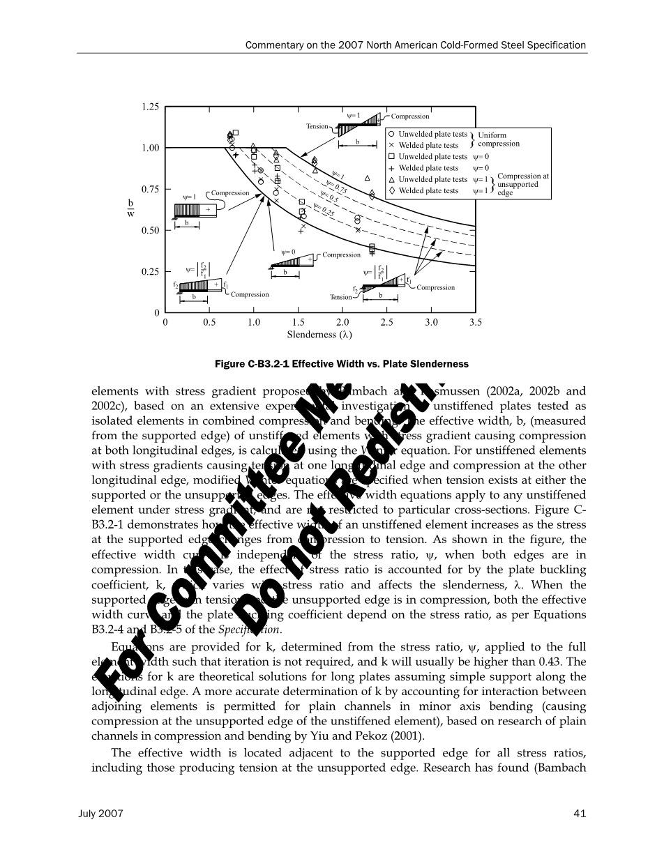 基于对非加强板件的广泛实验研究,该板作为组合受压和弯曲中的独立板件进行测试。使用Winter方程计算非加强板件的有效宽度b(从支撑边缘测量),其中应力梯度在两个纵向边缘处引起压缩。对于具有应力梯度的非加强板件,在一个纵向边缘处引起张力而在另一个纵向边缘处受压,当在支撑边缘或无支撑边缘处存在张力时,规定修正的Winter方程。有效宽度方程适用于应力梯度下的任何非加强板件,并且不限于特定的横截面。图C-B3.2-1说明了非加强板件的有效宽度如何随着受支撑边缘处的应力从压缩变为拉伸而增加。如图所示,当两个边缘处于受压状态时,有效宽度曲线与应力比无关。在这种情况下,应力比的影响由板屈曲系数k来决定,k随着应力比而变化并影响长细比lambda; 。当支撑边缘处于拉伸状态且无支撑边缘处于受压状态时,有效宽度曲线和板屈曲系数均取决于应力比,如规范B3.2-4和B3.2-5的公式所示。