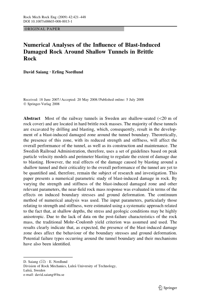 评估隧道周围爆炸引起的受损岩石的一个重要原因是稳定性。在这方面,该区域的强度和刚度是最重要的参数。到目前为止,这些参数的量化一直很困难。因此,将该区域纳入隧道的早期设计阶段通常涉及计算机模型,并不容易,因此,通常要么被忽视,要么如果尝试,则使用针对未受损岩体的程序建模。隧道周围受损岩体的数值模拟已经使用连续和非连续方法完成。但是,Barla等人。(1999)指出,任何数值模拟过程成功的关键是在描述岩体条件时所达到的理解水平。如果在分析中需要考虑爆炸引起的损坏区域,尤其是需要对该区域的机械特性进行定量理解,则这可能变得更加困难。如果没有这种定量理解,连续分析方法通常优先于不连续方法,因为后者需要对岩体进行明确描述。因此,许多研究人员,尤其是杨等人。(1993),冯(2000),盛(2002)和佐藤(2000)等人使用连续体方法研究靠近开挖边界的受损岩体的行为。