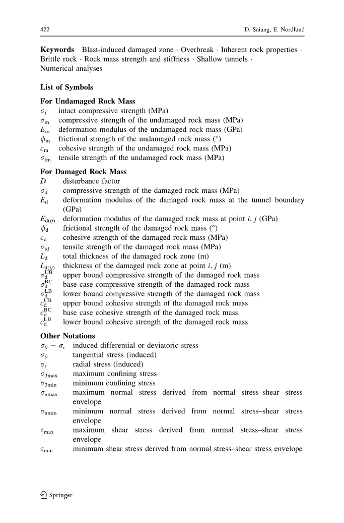 一个重要的问题是,浅埋隧道周围爆炸引起的受损岩石的存在对于稳定性和性能是否重要。通过直觉和考虑挖掘的性质,它通常被认为是重要的,因此是设计和施工指南的一个因素。然而,正如其他地方所述,这种考虑主要基于与过度爆发有关的方法。这些方法不能测量受损岩石的能力。它是受损岩石的固有特性,特别是其强度和刚度,它提供了能力的度量,因此直接与隧道的稳定性和性能相关。不可否认,这些在实践中很难测量参数。然而,当BIDZ的固有特性变化时,数值方法可用于测试不同的情况。因此,本文就是朝这个方向发展的。