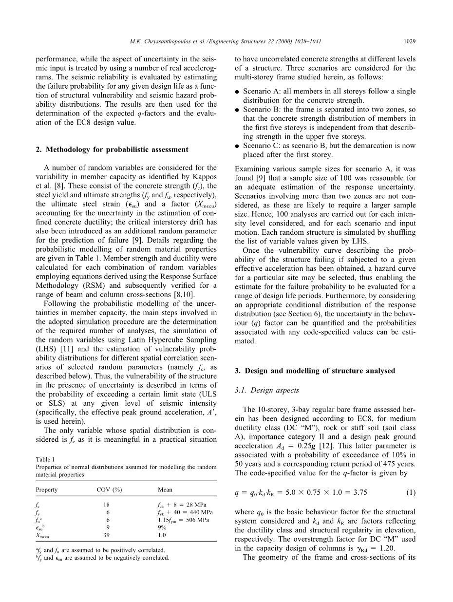 本研究遵循与上述调查不同的程序,其中第一阶段涉及对设计用于 EC8 的 R/C 框架的概率评估。这是通过考虑随机构件容量和层间漂移以及地震输入的不确定性来实现的,结果以脆弱性(或脆弱性)曲线的形式呈现,给出了不同地震强度级别的失效概率。虽然 Arede 和 Pinto [7] 也估计了按照相同代码设计的 R/C 建筑物的故障概率,但强调了不同的设计场景,并且使用稍微修改的漏洞函数版本得出了故障概率的下限和上限方法。本文采用的方法能够更彻底地考虑与结构性能相关的不确定性,而地震输入中的不确定性方面则通过使用多个真实加速度图来处理。地震可靠性是通过估计任何给定设计寿命的失效概率作为结构易损性和地震危险概率分布的函数来评估的。然后将结果用于确定预期q-因素和EC8设计值的评估。