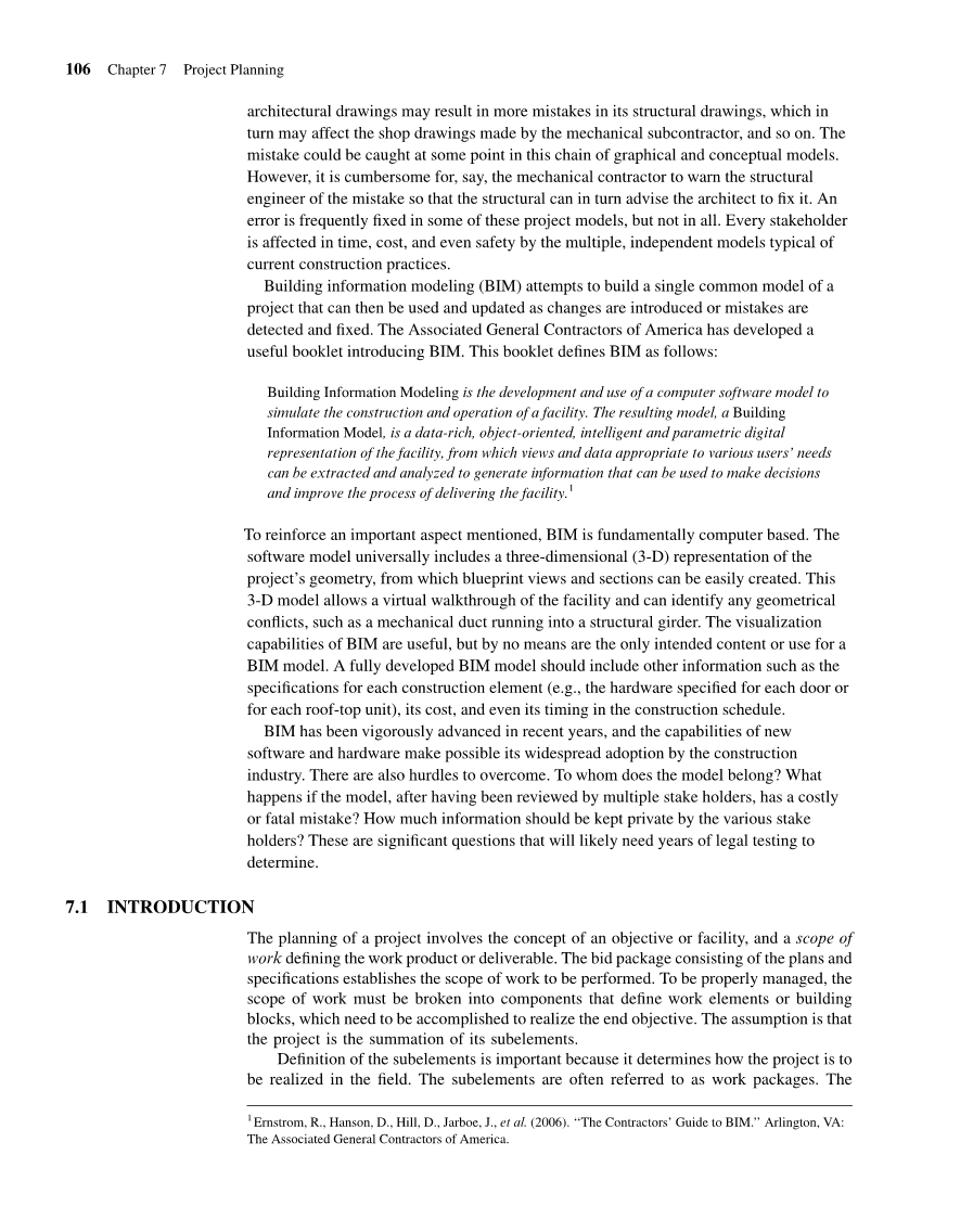 建筑项目模型是实际建筑结构的替代品。模型可以显示项目的几何形状,就像其蓝图一样,或者可以描述更概念性的方面, 例如其建筑操作的顺序或其组件的成本。尽管这个术语模型看起来不常见,但建设项目的每个参与者都需要一个能够满足他们特殊需求的参与者。因此,一个项目有几十个独立的、连续开发的模型,每个模型都有可能的错误,可以传播到其他模型中。该文件中的一个绘图错误建筑图纸可能导致其结构图纸出现更多错误,进而影响机械分包商制作的施工图,等等。这个错误可能会在这个图形化和概念性模型链中的某个时候被发现。然而,对于机械承包商来说,警告结构工程师这个错误,这样结构工程师就可以反过来建议建筑师修理这个错误是很麻烦的。在这些项目模型中,一个错误经常被修复,但并不是全部。每个利益相关者在时间、成本甚至安全上都受到当前施工实践中典型的多种、独立模型的影响。