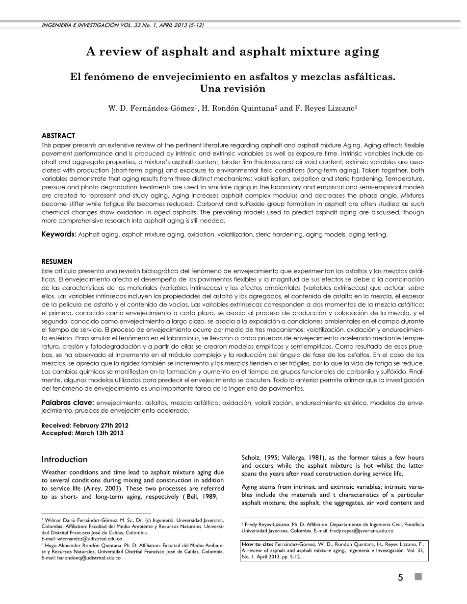 流变变化反映了进行老化处理的沥青材料的粘弹性性能。流变试验提供了有关粘弹性材料中应力 - 应变关系的信息,从而帮助建立了世界不同地区(包括哥伦比亚)使用的沥青和沥青粘结剂的结构方程。Allen et al.,(2012)使用原子显微镜观察沥青粘合剂微流变性质以评价老化程度。