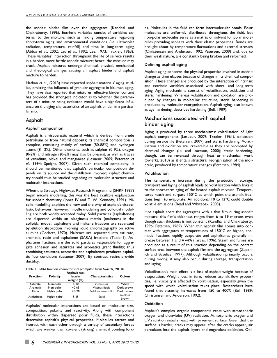 老化由三种机制产生:轻质沥青组分的挥发(Lesueur, 2009; Traxler, 1961),使用寿命期间的氧化(Petersen, 2009)和硬化。挥发和氧化是不可逆的,因为它们是由化学变化引起的(Lu and Isacsson, 2000), 但是硬化可以通过加热或机械作用来逆转(Swiertz, 2010),因为它需要由温度变化使分子的结构重组(Petersen, 1984)。
