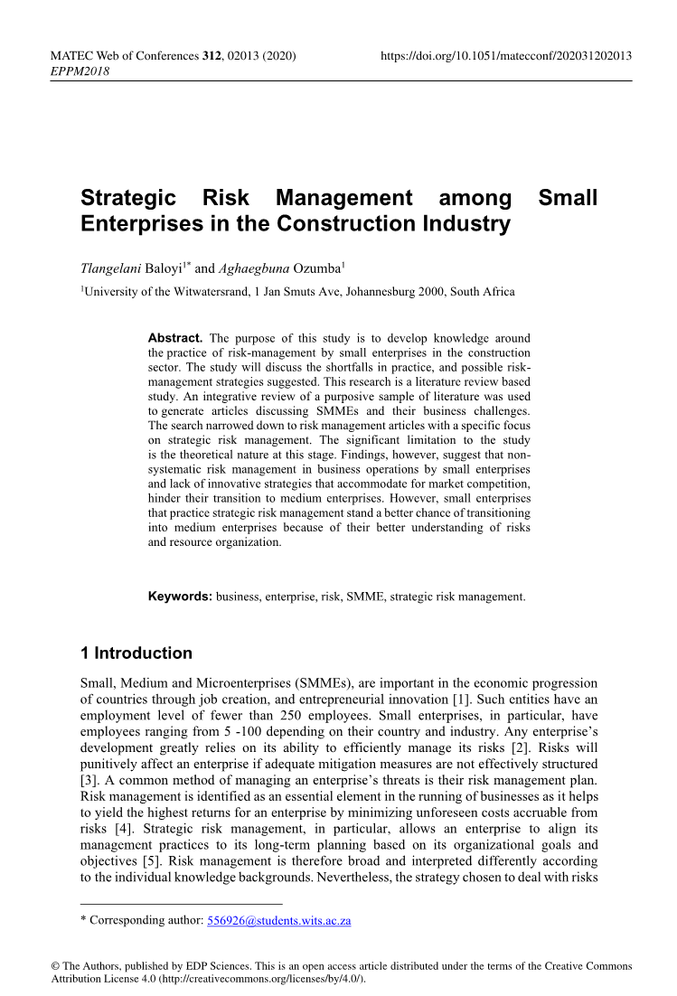 本研究的目的是围绕建筑部门小企业风险管理的实践发展知识。这项研究将讨论实践中的不足,以及可能提出的风险管理战略。本研究是一项基于文献综述的研究。 对有目的文献样本的综合回顾被用来生成讨论中小型企业及其业务挑战的文章。搜索范围缩小到风险管理文章,特别侧重于战略风险管理。 研究的重大局限性是现阶段的理论性质。然而,调查结果表明,小企业在商业运作中没有系统的风险管理,缺乏适应市场竞争的创新战略,阻碍了它们向中等企业的过渡。 然而,实施战略风险管理的小企业由于更好地理解风险和资源组织,有更好的机会过渡到中型企业。