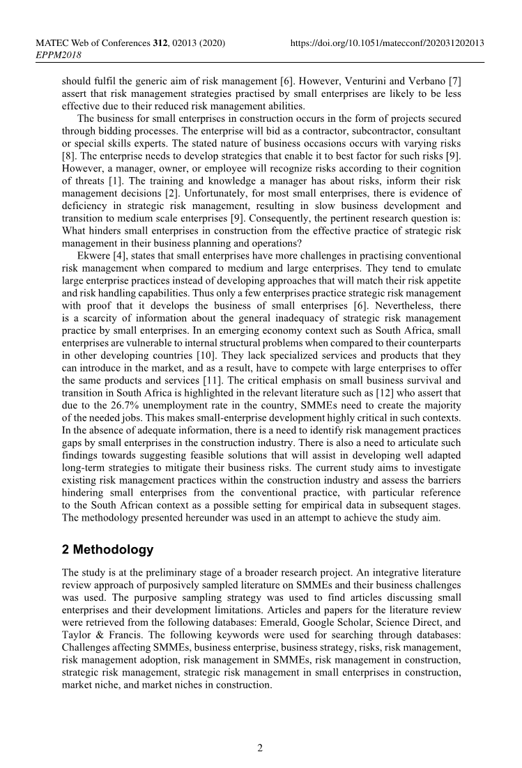 Ekwere[4]指出,与中型和大型企业相比,小型企业在实施常规风险管理方面面临更多挑战。 他们倾向于模仿大型企业的做法,而不是开发与他们的风险偏好和风险处理能力相匹配的方法。因此,只有少数企业实践战略风险管理,证明它发展了小企业的业务[6]。 然而,关于小企业战略风险管理做法普遍不足的信息很少。 在南非等新兴经济背景下,与其他发展中国家的同行相比,小企业容易受到内部结构问题的影响[10]。 他们缺乏他们可以在市场上引进的专门服务和产品,因此不得不与大型企业竞争,以提供相同的产品和服务[11]。 [12]等相关文献强调了对南非小企业生存和转型的关键重视,这些文献声称,由于南非的失业率为26.7%,中小型企业需要创造大部分所需的就业机会。这使得小企业发展在这种情况下具有高度重要性。 在缺乏充分信息的情况下,需要查明建筑业小企业在风险管理做法方面的差距。 还需要阐明这些调查结果,以便提出可行的解决办法,协助制定适应良好的长期战略,以减轻其业务风险。 目前的研究旨在调查建筑业现有的风险管理做法,并评估阻碍小企业采用常规做法的障碍,特别是考虑到南非的情况,以此作为今后各阶段经验数据的可能依据。 以下所述方法是为了实现研究目的而使用的。