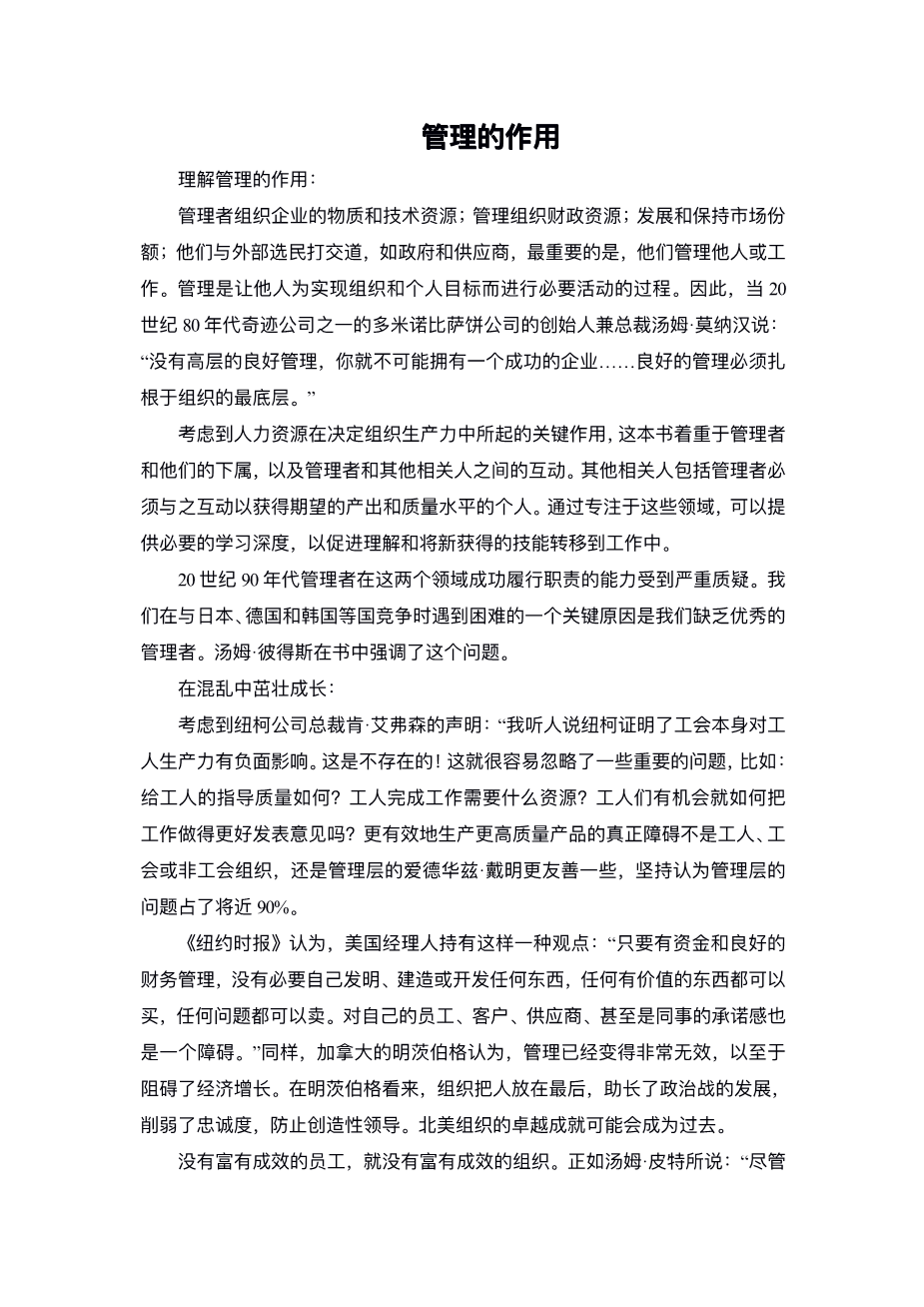 Managers organize the enterprisersquo;s physical and technical resources; they manage the organizationrsquo;s financial resources; they develop and maintain market share; they deal with external constituencies, such as government and suppliers; and most importantly, they manage others or their work. Management is the process of getting others to perform activities necessary to achieve organizational and personal goals. There fore, we are not surprised when Tom Monahan, founder and president of Dominorsquo;s Pizza—one of the wonder firms of the 1980s—stated,“You cannot have a successful business with just good management at the tophellip;Good management has to go right down to the lowest levels of the organization.”