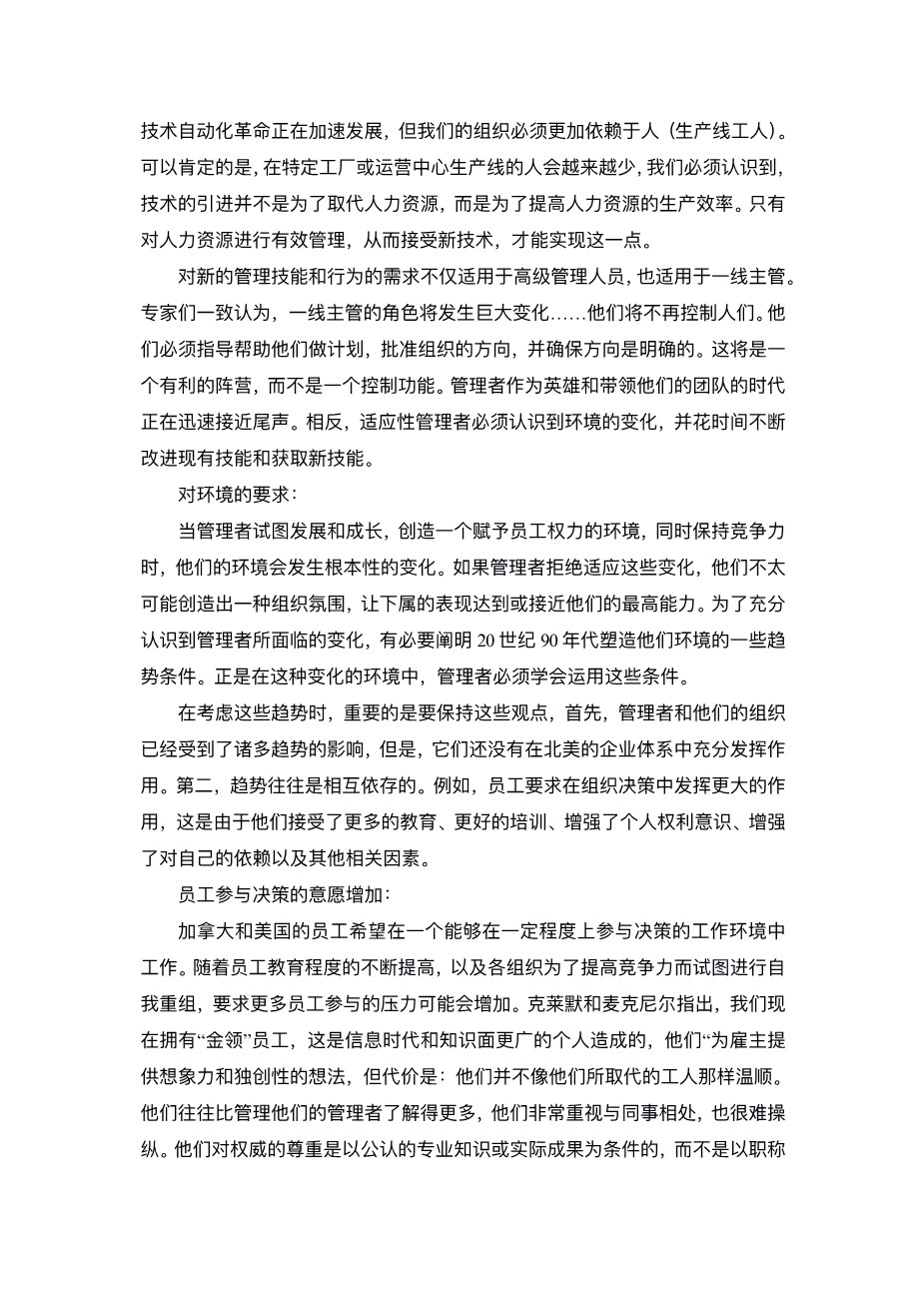 The need for new management skills and behaviors not only applies to senior managers but to front-line supervisors as well.“Experts agree that the first line supervisorrsquo;s role will change dramaticallyhellip;They arenrsquo;t going to control people anymore. They have to coach them, help to do the planning, approve organization direction, and make sure the directions are clear. It will be an enabling faction rather than a control function.”The era in which managers function as heroes and “carry” their group is rapidly drawing to a close.Instead, the adaptive manager must recognize the changes in the environment and take the time to continually improve existing skills and acquire new ones.