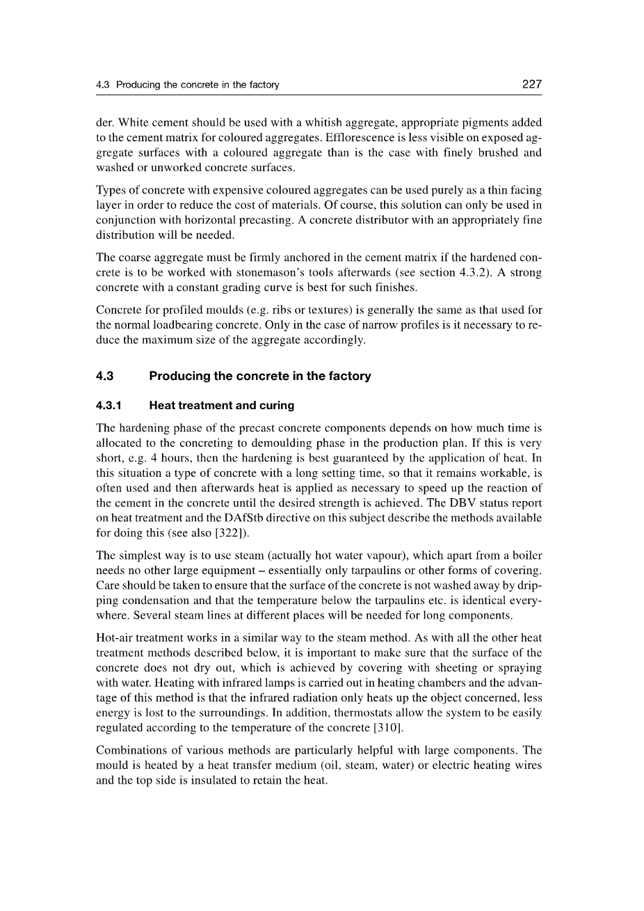 预制混凝土构件的硬化阶段取决于生产计划中混凝土到脱模阶段的时间分配。如果时间很短,例如4小时,那么最好通过加热来保证硬化。在这种情况下,通常使用一种凝结时间较长的混凝土,使其保持可用,然后在必要时加热,以加速水泥在混凝土中的反应,直到达到所需的强度。关于热处理的DBV状态报告和关于该主题的DAfStb指令描述了可用于此目的的方法(参见[322])。