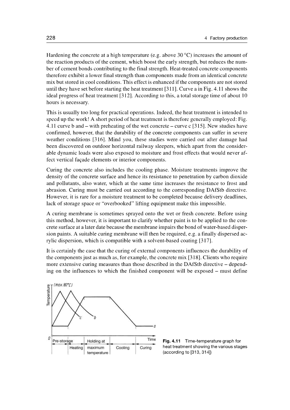 这对于实际操作来说通常太长了。的确,热处理是为了加快工作速度!因此,一般采用较短的热处理周期:图4.11曲线b和-随着湿混凝土预热-曲线c[315]。然而,新的研究已经证实,混凝土构件的耐久性在恶劣的天气条件下会受到影响[316]。请注意,这些研究是在发现户外卧式铁路枕木的损伤后进行的,这些枕木除了承受相当大的动荷载外,还暴露在潮湿和霜冻的影响下,而这些影响绝不会影响垂直立面元素或内部构件。