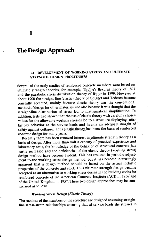 早期的几项钢筋混凝土构件研究都是基于极限强度理论,例如1897年Thullie的弯曲理论和1899年Ritter的抛物线应力分布理论。然而,大约在1900年,Coignet和Tedesco的直线(弹性)理论被普遍接受,这主要是因为弹性理论是其他材料的常规设计方法,也时因为人们认为应力的直线分布导致了数学上的简化。此外,试验表明,使用弹性理论和精心选择的许用工作应力值可使结构在工作荷载下表现出令人满意的性能,并具有足够的防倒塌安全裕度。因此,弹性理论多年来一直是钢筋混凝土设计的基础。