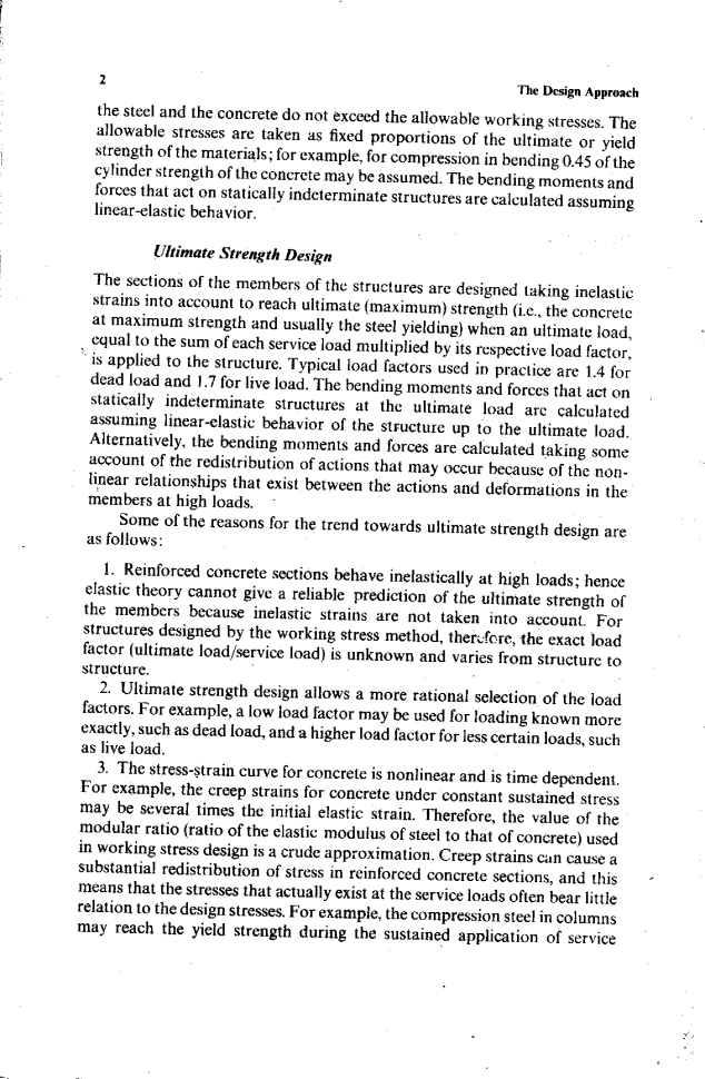 1.钢筋混凝土截面在高荷载下表现为非弹性,因此弹性理论不能可靠地预测构件的极限强度,因为没有考虑非弹性应变。因此,对于按工作应力法设计的结构,精确的荷载系数(极限荷载/使用荷载)是未知的,并且因结构而异。