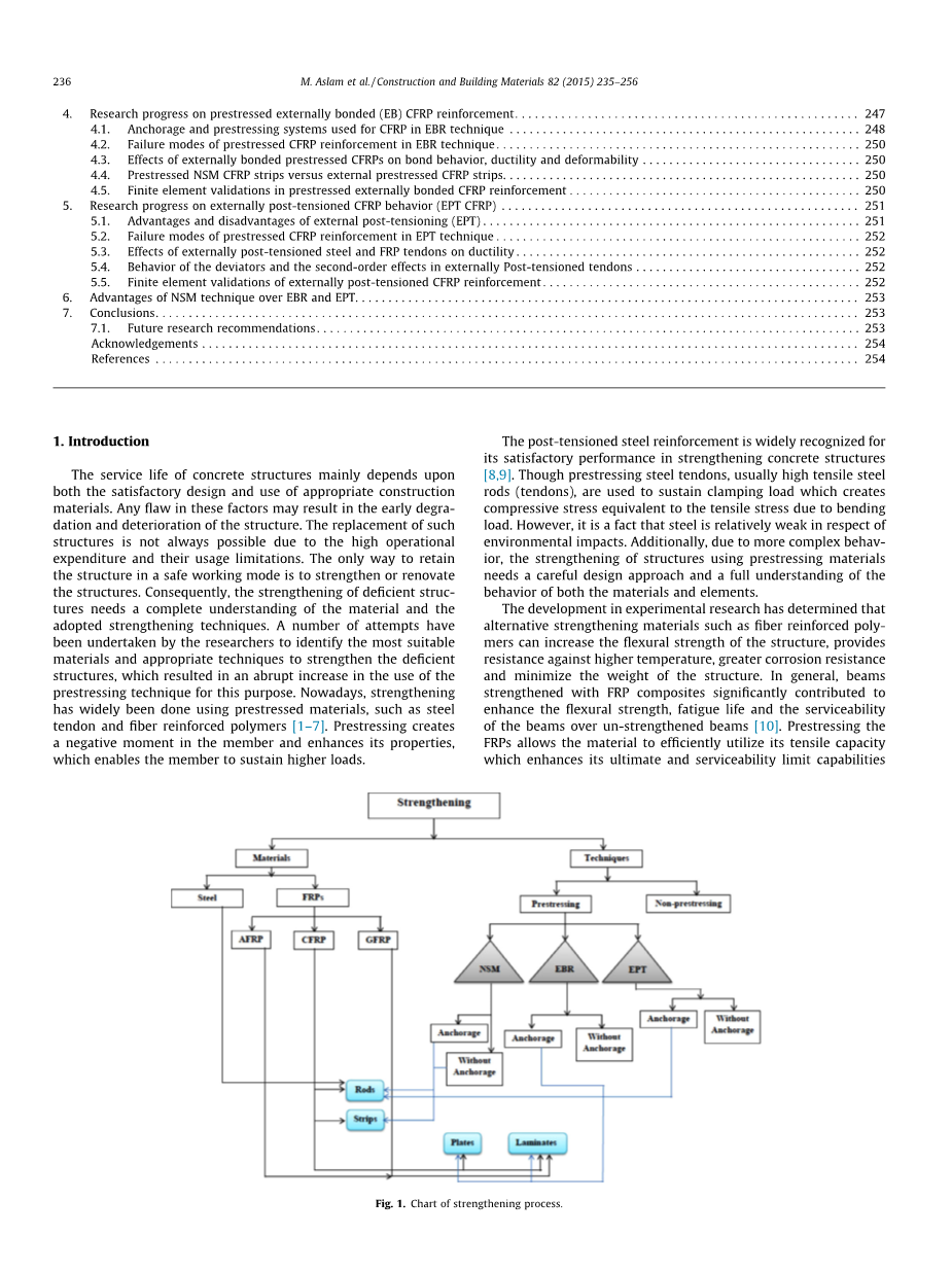 混凝土结构的使用寿命主要取决于合理的设计和施工材料的适当使用。这些因素中的任何缺陷都可能导致结构的早期退化和结构恶化。由于高运营支出及其使用限制,并不总是可以更换这种结构。使结构保持安全工作状态的唯一方法是对结构进行加固或改造。因此,对缺陷结构的加固需要对材料和采用的加固技术有全面的了解。研究人员已进行了若干次努力,确定最适当的材料和技术来加强不足的结构,这导致了预应力技术使用率的突然增加。目前,钢筋、纤维增强聚合物等预应力材料的加固已得到广泛应用[1-7]。预应力在构件中产生负弯矩,增强了构件的性能,使构件能够承受更高的荷载。
