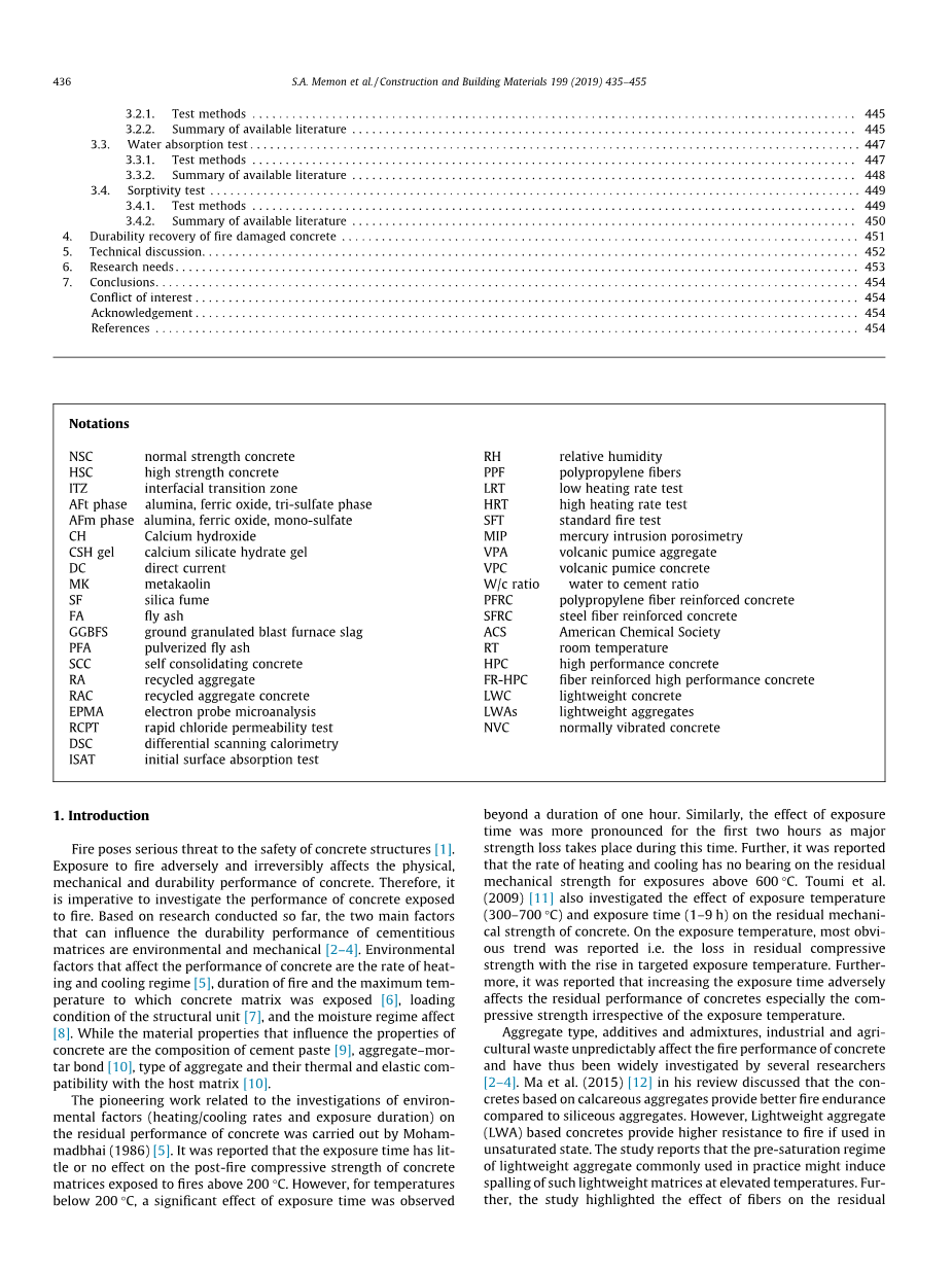 混凝土的力学性能是火灾暴露中最关键的因素,因此被广泛研究 和评述。然而,在任何情况下,混凝土的耐久性能都不能也不应该 被破坏。本文总结了有关混凝土耐火后耐久性的现有数据。此外, 已经详细讨论了导致混凝土耐久性特性下降的因素。进行了广泛的 文献调查,以确定未来的灰色和潜在研究领域。本文主要分为三个 部分。第一部分阐述了火灾对混凝土的理化性质和剥落的影响。第 二部分详细讨论了可用的耐久性测试方法以及可持续混凝土的后燃 耐久性能。第三部分讨论了火灾混凝土的耐久性恢复。此外,还确 定了研究需求。