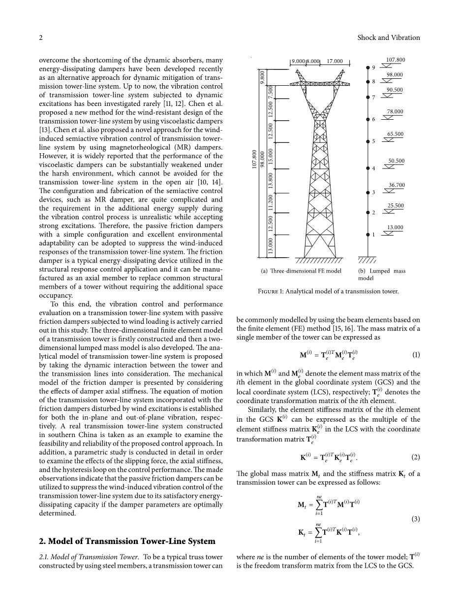 传输塔的三维(3D)FE模型如图1(a)所示。如果由于大量的结构构件和部件而使输电塔的结构非常复杂,则可以预期塔的自由度(DOFs)的显著数量。因此,对于动态响应计算和对控制性能的研究是不切实际的,因为时域中的数字逐步积分将非常耗时。此外,塔上的动态激励,例如风荷载,通常可以建模为时间上的静止或非平稳随机过程,并且在空间中是非均匀的。对传输塔的复杂三维有限元模型的动态加载的模拟需要大量的计算工作。从实际的角度来看,具有有限自由度的输电塔的简单分析模型对于结构动力响应和参数研究的研究更为合理。在这方面,二维(2D)集总质量模型通常在实践中用于检查复杂传输塔的动态响应。
