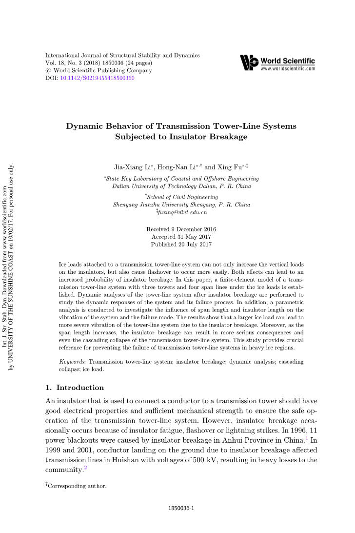 关键词:输电铁塔线路系统;绝缘子断裂;动力分析;级联倒塌;冰荷载。