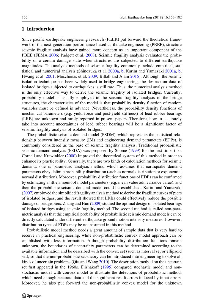(Shinozuka et al。2000a, b;卡里姆和山崎2001a, b;黄等人。2001;Moschonas等。2009;比拉和阿拉姆2015).虽然地震隔离技术已广泛应用于桥梁工程,但遭受地震 的孤立桥梁的破坏数据仍然很少。因此,数值分析方法是推导孤立桥梁地震脆弱性 的唯一有效方法。目前,概率模型通常用于桥梁结构的地震脆弱性分析,模型的特 征是必须预先定义随机变量的概率密度函数。然而,铅橡胶轴承(LRB)的机械参 数(例如屈服力和屈服后刚度)的概率密度函数是未知的,并且在本文中很少报道。因此,如何准确地考虑铅芯橡胶支座的不确定性将是隔震桥梁地震脆弱性分析的重 要因素。