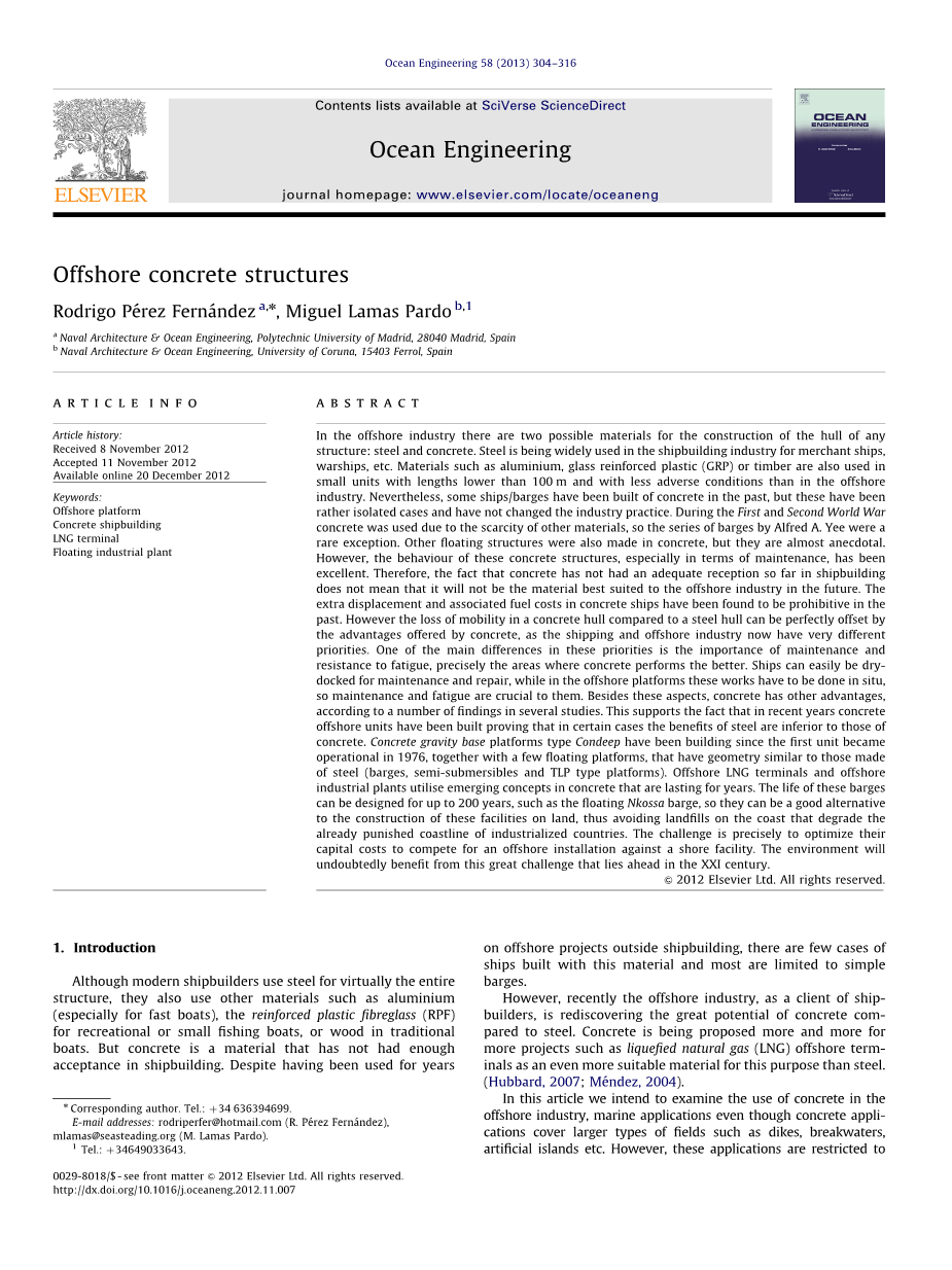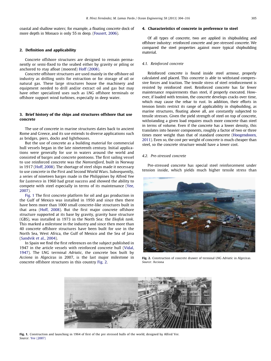 在海上工业中,有两种可能的材料用于构造任何结构的船体:钢和混凝土。钢铁被广泛用于造船业,用于商船,军舰等。铝,玻璃钢(GRP)或木材等材料也用于长度小于100米的小型装置,其不利条件比海上工业小。尽管如此,有些船/驳船过去是用混凝土建造的,但这些都是相当孤立的案例并没有改变行业惯例。在第一次世界大战和第二次世界大战期间,由于其他材料的稀缺性,使用了混凝土,所以Alfred A. Yee的一系列驳船是一个罕见的例外。其他浮动结构也是用混凝土制成的,但它们几乎都是轶事。但是,这些混凝土结构的性能,特别是在维修方面,一直很优秀。因此,迄今为止混凝土在造船方面尚未获得足够的接受这一事实并不意味着它不会成为未来最适合海上工业的材料。已发现混凝土船舶的额外费用和相关的燃料成本是令人望而却步的,然而,与钢壳相比,混凝土船体的机动性损失可以完全抵消混凝土提供的优势,因为航运和海上工业现在有非常不同的优先事项。这些优先事项的主要区别之一是维护和耐疲劳的重要性,恰好是混凝土表现更好的区域。船舶可以很容易地进行干船坞养护和维修,而在海上平台,这些工作必须在现场进行,所以维护和疲劳对他们至关重要。除了这些方面,混凝土还有其他优点,根据几项研究中的一些发现。这支持了近年来的具体事实,已经建造了海上装置,证明在某些情况下钢铁的优点低于混凝土的优点。 Condeep混凝土重力基础平台自第一台机组成型以来一直在建造,1976年开始运作,加上一些浮动平台,其几何形状与制造的几何钢相似(驳船,半潜式和TLP型平台)。海上LNG终端和海上工业工厂利用持续多年的混凝土新兴概念。这些驳船的寿命可以设计长达200年,例如漂浮的Nkossa驳船,因此它们可以是一个很好的选择。在陆地上建造这些设施,从而避免海岸上垃圾填埋地,尤其是已经惩罚了工业化国家的海岸线的土地。挑战恰恰是优化他们的与岸上设施竞争海上设施的资本成本。对于环境来说毫无疑问,这将得益于二十一世纪未来的巨大挑战。