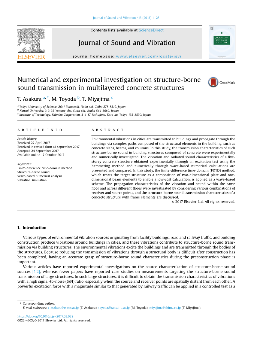 城市的环境振动通过建筑中由结构元素组成的复杂路径(如混凝土板、梁和柱)传递到建筑中,并在建筑中传播。本文通过实验和数值模拟研究了这种结构声在混凝土结构中的传播特性。本文介绍了用锤击法对某五层混凝土结构进行激振试验和基于波的数值计算得到的振动和辐射声特性,并进行了比较。在本研究中,有限差分时域法(FDTD)将目标结构视为二维板单元和一维梁单元的组合,从而使计算成本更低,被应用于基于波的方案。摘要通过考虑受振点和声源点的不同组合,研究了振动和声在同一楼层和不同楼层间的传播特性,讨论了框架单元混凝土结构的结构传声特性。爱思唯尔有限公司 |