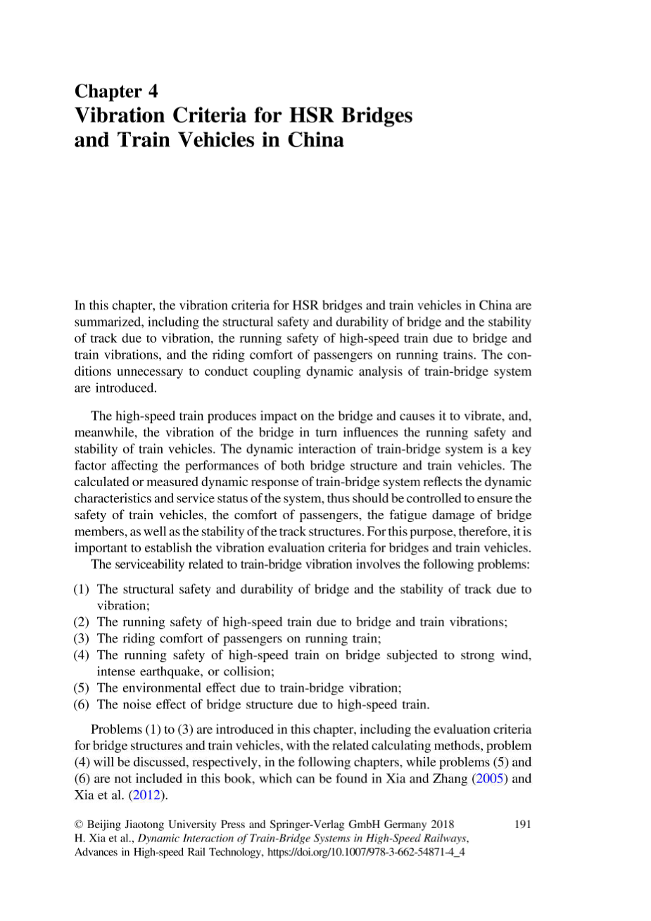 在这一章,总结了我国高速桥梁和列车车辆的振动标准,包括桥梁的结构安全性和耐久性,振动引起的轨道稳定性,桥梁和列车振动引起的高速列车的运行安全性,以及列车运行中乘客的乘坐舒适性。介绍了列车-桥梁系统不需要进行耦合动力分析的条件。